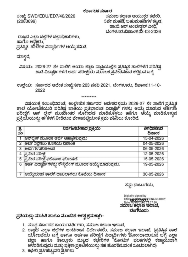 ಕರ್ನಾಟಕ ಸರ್ಕಾರದ ಸಮಾಜ ಕಲ್ಯಾಣ ಇಲಾಖೆಯು ರಾಜ್ಯದ ಪರಿಶಿಷ್ಟ ಜಾತಿಯ (SC) ಪ್ರತಿಭಾವಂತ ವಿದ್ಯಾರ್ಥಿಗಳಿಗೆ ಒಂದು ಸುವರ್ಣ ಅವಕಾಶವನ್ನು ಕಲ್ಪಿಸಿದೆ. 2026-27ನೇ ಶೈಕ್ಷಣಿಕ ಸಾಲಿನಲ್ಲಿ ಜಿಲ್ಲಾ ಮಟ್ಟದ ಪ್ರತಿಷ್ಠಿತ ಶಾಲೆಗಳಿಗೆ ಪ್ರವೇಶ ಪಡೆಯಲು ಇಚ್ಛಿಸುವ ವಿದ್ಯಾರ್ಥಿಗಳಿಂದ ಆನ್ಲೈನ್ ಮೂಲಕ ಅರ್ಜಿಗಳನ್ನು ಆಹ್ವಾನಿಸಲಾಗಿದೆ. ಈ ಯೋಜನೆಯು ಗ್ರಾಮೀಣ ಮತ್ತು ನಗರ ಪ್ರದೇಶದ ಆರ್ಥಿಕವಾಗಿ ಹಿಂದುಳಿದ ಹಾಗೂ ಪ್ರತಿಭಾವಂತ ಎಸ್ಸಿ ವಿದ್ಯಾರ್ಥಿಗಳಿಗೆ ಗುಣಮಟ್ಟದ ಶಿಕ್ಷಣ ನೀಡುವ ಉದ್ದೇಶವನ್ನು ಹೊಂದಿದೆ. ಈ ಪ್ರವೇಶಾತಿಯು ಕೇವಲ ನೇರ ದಾಖಲಾತಿಯಾಗಿರದೆ, ಅರ್ಹತಾ ಪರೀಕ್ಷೆಯ ಮೂಲಕ ಅತ್ಯಂತ ಪಾರದರ್ಶಕವಾಗಿ ನಡೆಯಲಿದೆ.