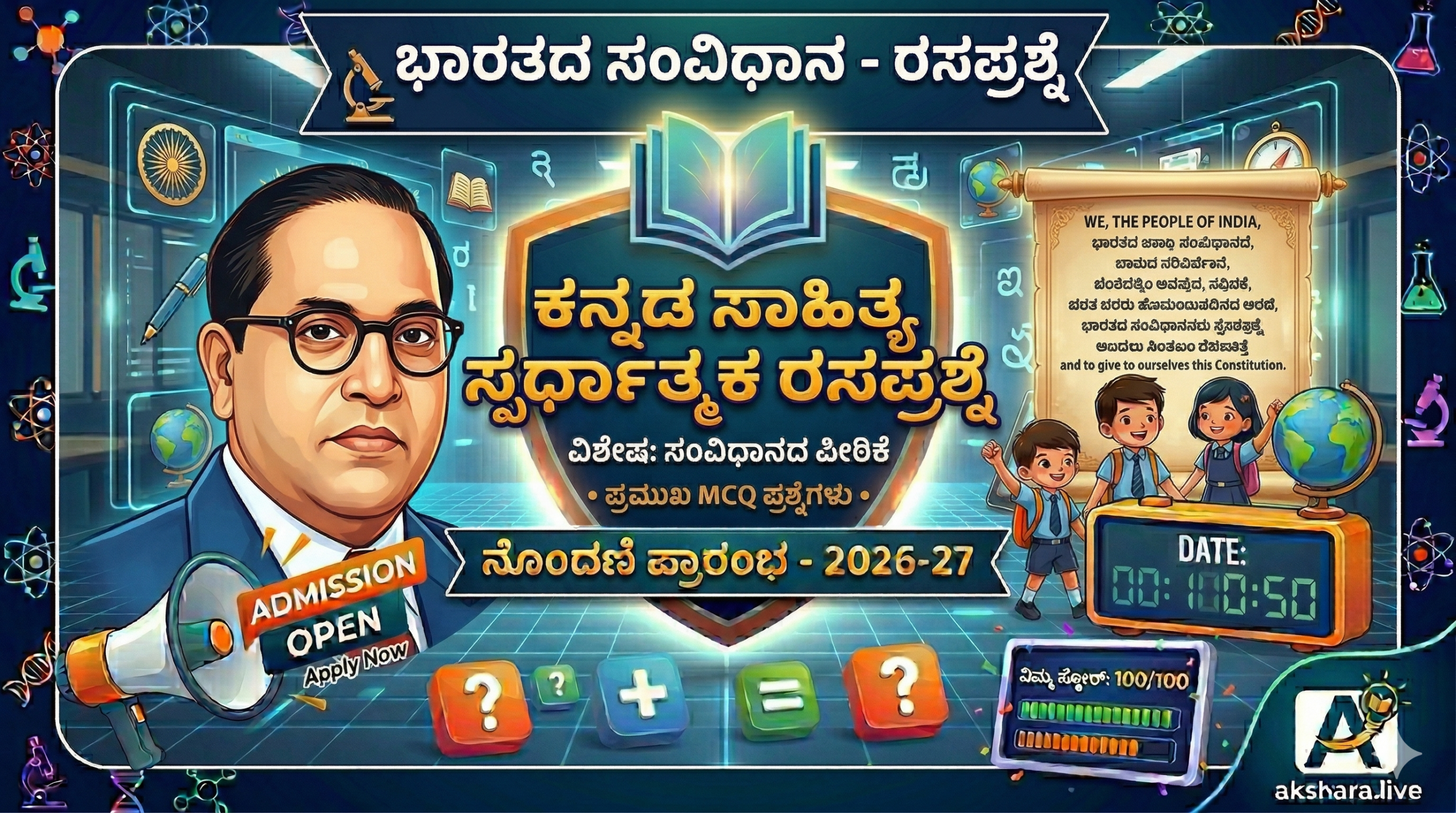 ಭಾರತದ ಸಂವಿಧಾನವು ಕೇವಲ ಒಂದು ಕಾನೂನು ಪುಸ್ತಕವಲ್ಲ, ಅದು ನಮ್ಮ ದೇಶದ ಜೀವಾಳ. TET, FDA, SDA, ಮತ್ತು KAS ನಂತಹ ಸ್ಪರ್ಧಾತ್ಮಕ ಪರೀಕ್ಷೆಗಳಲ್ಲಿ ಸಂವಿಧಾನದ ವಿಧಿಗಳು ಮತ್ತು ತಿದ್ದುಪಡಿಗಳ ಕುರಿತು ಹೆಚ್ಚಿನ ಪ್ರಶ್ನೆಗಳನ್ನು ಕೇಳಲಾಗುತ್ತದೆ. ಈ ಮೇಲೆ ನೀಡಲಾದ 100 MCQ ರಸಪ್ರಶ್ನೆಯು ನಿಮ್ಮ ಸಿದ್ಧತೆಯನ್ನು ಉತ್ತಮಗೊಳಿಸಲು ಮತ್ತು ಆತ್ಮವಿಶ್ವಾಸವನ್ನು ಹೆಚ್ಚಿಸಲು ಸಹಕಾರಿಯಾಗಿದೆ ಎಂದು ನಾವು ನಂಬುತ್ತೇವೆ.