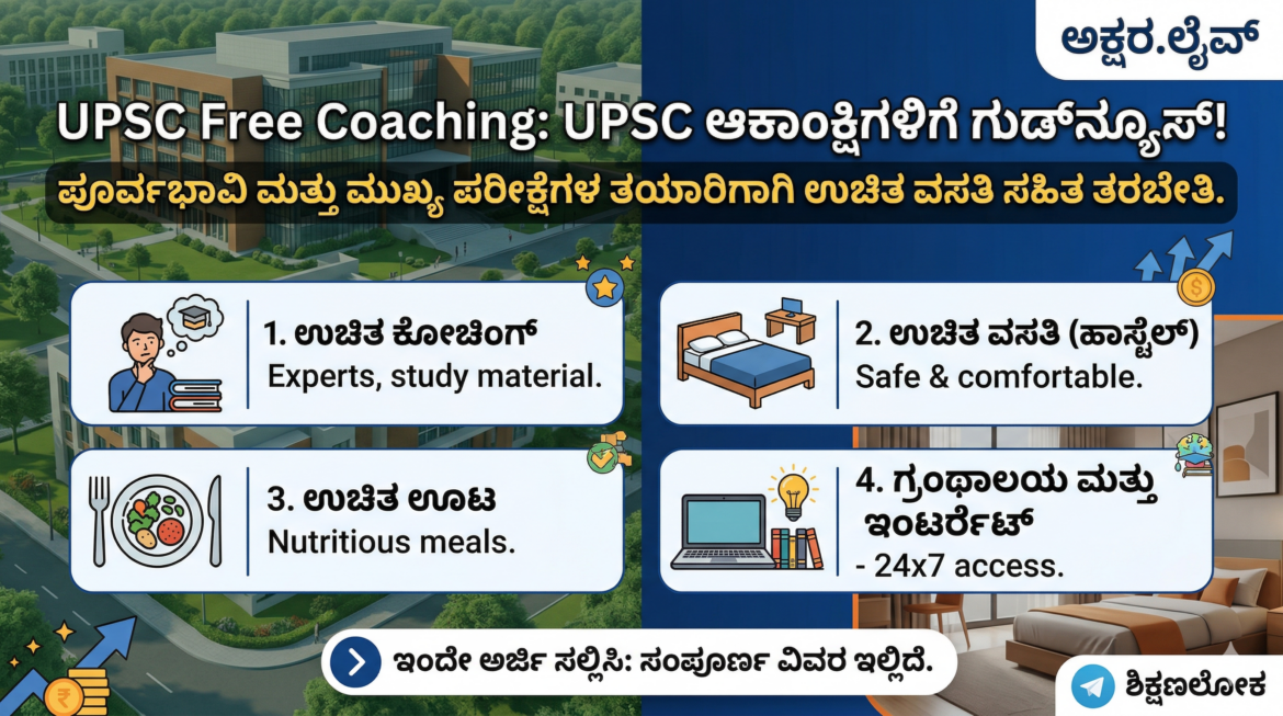 ತೀರ್ಮಾನ ಮತ್ತು ಆಕಾಂಕ್ಷಿಗಳಿಗೆ ಸಲಹೆ: ಯುಪಿಎಸ್ಸಿ ಎಂಬುದು ಕೇವಲ ಬುದ್ಧಿವಂತಿಕೆಯ ಪರೀಕ್ಷೆಯಲ್ಲ, ಇದು ತಾಳ್ಮೆ ಮತ್ತು ಪರಿಶ್ರಮದ ಪರೀಕ್ಷೆಯಾಗಿದೆ. ಆರ್ಥಿಕ ಅಡಚಣೆ ನಿಮ್ಮ ಗುರಿಯ ಹಾದಿಯಲ್ಲಿ ಅಡ್ಡಿಯಾಗಬಾರದು ಎಂಬುದು ಈ ಉಚಿತ ತರಬೇತಿ ಯೋಜನೆಗಳ ಆಶಯವಾಗಿದೆ. ಲಭ್ಯವಿರುವ ಈ ಅವಕಾಶವನ್ನು ಸದುಪಯೋಗಪಡಿಸಿಕೊಂಡು, ಶಿಸ್ತುಬದ್ಧವಾಗಿ ಅಧ್ಯಯನ ಮಾಡಿದರೆ ಐಎಎಸ್ ಅಥವಾ ಐಪಿಎಸ್ ಆಗುವುದು ದೂರದ ಮಾತಲ್ಲ. ನೀವು ದೇಶದ ಆಡಳಿತ ವ್ಯವಸ್ಥೆಯಲ್ಲಿ ಬದಲಾವಣೆ ತರಲು ಬಯಸಿದರೆ, ತಡ ಮಾಡದೆ ಇಂತಹ ಉಚಿತ ತರಬೇತಿ ಕಾರ್ಯಕ್ರಮಗಳಿಗೆ ನೋಂದಾಯಿಸಿಕೊಳ್ಳಿ. ನಿಮ್ಮ ಕಠಿಣ ಪರಿಶ್ರಮಕ್ಕೆ ಸರ್ಕಾರದ ಬೆಂಬಲ ಖಂಡಿತ ಸಿಗಲಿದೆ. ಇಂತಹ ಮತ್ತಷ್ಟು ಉಪಯುಕ್ತ ಶೈಕ್ಷಣಿಕ ಅಪ್ಡೇಟ್ಗಳಿಗಾಗಿ ನಮ್ಮ ಅಕ್ಷರ.ಲೈವ್ ವೆಬ್ಸೈಟ್ ಅನ್ನು ಸದಾ ಅನುಸರಿಸುತ್ತಿರಿ.