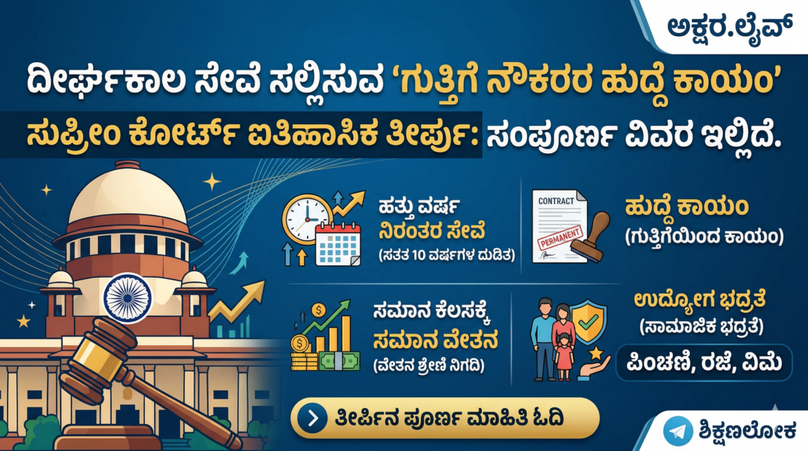 ತೀರ್ಮಾನ ಮತ್ತು ಭವಿಷ್ಯದ ಹಾದಿ: ಒಟ್ಟಾರೆಯಾಗಿ, ಸುಪ್ರೀಂ ಕೋರ್ಟ್ನ ಈ ತೀರ್ಪು ಗುತ್ತಿಗೆ ನೌಕರರ ಪಾಲಿಗೆ ಸಂಜೀವಿನಿಯಿದ್ದಂತೆ. ಇದು ಕೇವಲ ಒಂದು ತೀರ್ಪಲ್ಲ, ಬದಲಿಗೆ ಶ್ರಮಿಕ ವರ್ಗದ ಹಕ್ಕುಗಳ ರಕ್ಷಣೆಗೆ ನ್ಯಾಯಾಲಯವು ಹಾಕಿಕೊಟ್ಟ ಭದ್ರ ಬುನಾದಿಯಾಗಿದೆ. ಸರ್ಕಾರಗಳು ಆರ್ಥಿಕ ಹೊರೆಯ ನೆಪವೊಡ್ಡದೆ, ನ್ಯಾಯಾಲಯದ ಈ ನಿರ್ದೇಶನಗಳನ್ನು ಪ್ರಾಮಾಣಿಕವಾಗಿ ಜಾರಿಗೆ ತರಬೇಕಿದೆ. ಸಮಾಜದಲ್ಲಿ ಸಮಾನತೆ ಮತ್ತು ನ್ಯಾಯವನ್ನು ಎತ್ತಿಹಿಡಿಯುವಲ್ಲಿ ಈ ತೀರ್ಪು ಪ್ರಮುಖ ಪಾತ್ರ ವಹಿಸಲಿದೆ. ನಿಮ್ಮ ಹಕ್ಕುಗಳ ಬಗ್ಗೆ ಜಾಗೃತರಾಗಿರುವುದು ಮತ್ತು ಅಂತಹ ಕಾನೂನು ಬದಲಾವಣೆಗಳ ಬಗ್ಗೆ ನಿರಂತರವಾಗಿ ಮಾಹಿತಿ ಹೊಂದಿರುವುದು ಇಂದಿನ ಅಗತ್ಯವಾಗಿದೆ. ಇಂತಹ ಮಹತ್ವದ ಕಾನೂನು ಅಪ್ಡೇಟ್ಗಳು ಮತ್ತು ಸುದ್ದಿಗಳಿಗಾಗಿ ನಮ್ಮ ಅಕ್ಷರ.ಲೈವ್ ಪೋರ್ಟಲ್ ಅನ್ನು ಸದಾ ಅನುಸರಿಸುತ್ತಿರಿ.
