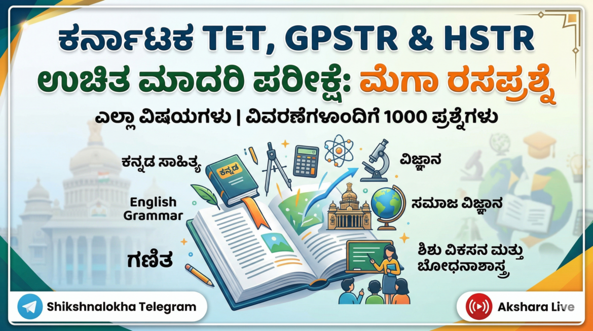 ಕರ್ನಾಟಕ ಸರ್ಕಾರಿ ಶಾಲಾ ಶಿಕ್ಷಕರಾಗುವುದು ಲಕ್ಷಾಂತರ ಯುವಕರ ಕನಸು. ಈ ಕನಸನ್ನು ನನಸಾಗಿಸಲು ಮೊದಲ ಮೆಟ್ಟಿಲು ಎಂದರೆ ಅರ್ಹತಾ ಪರೀಕ್ಷೆಗಳು (TET) ಮತ್ತು ನೇಮಕಾತಿ ಪರೀಕ್ಷೆಗಳು (GPSTR/HSTR). ಈ ಪರೀಕ್ಷೆಗಳು ಕೇವಲ ಓದಿನಿಂದ ಮಾತ್ರವಲ್ಲದೆ, ನಿರಂತರ ಅಭ್ಯಾಸ ಮತ್ತು ಮಾದರಿ ಪರೀಕ್ಷೆಗಳನ್ನು ಎದುರಿಸುವುದರಿಂದ ಮಾತ್ರ ಸುಲಭವಾಗುತ್ತವೆ. ನಿಮ್ಮ ಸಿದ್ಧತೆಗೆ ವೇಗ ನೀಡಲು ನಾವು ಈ ವಿಶೇಷ ‘ಮೆಗಾ ರಸಪ್ರಶ್ನೆ’ ಲೇಖನವನ್ನು ಸಿದ್ಧಪಡಿಸಿದ್ದೇವೆ.