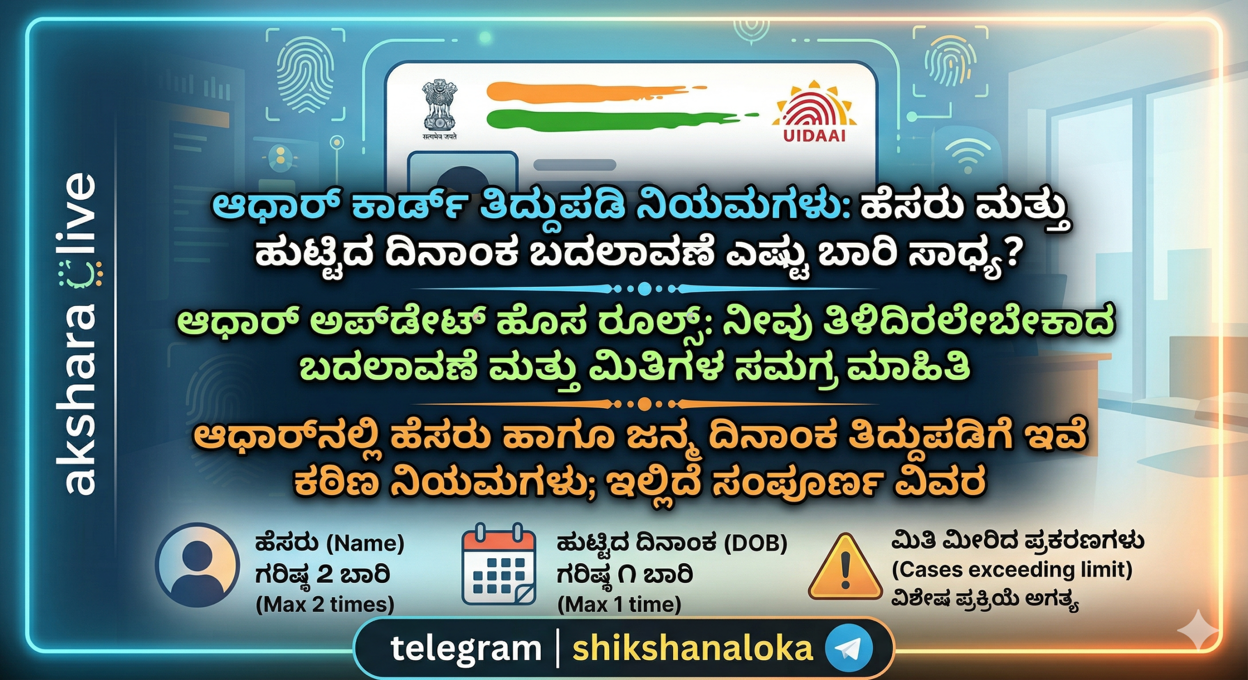 ಭಾರತೀಯ ವಿಶಿಷ್ಟ ಗುರುತಿನ ಪ್ರಾಧಿಕಾರ (UIDAI) ಆಧಾರ್ ಕಾರ್ಡ್ನಲ್ಲಿನ ಮಾಹಿತಿಯನ್ನು ಅಪ್ಡೇಟ್ ಮಾಡಲು ಕೆಲವು ಕಟ್ಟುನಿಟ್ಟಿನ ನಿಯಮಗಳನ್ನು ಜಾರಿಗೆ ತಂದಿದೆ. ಪ್ರತಿಯೊಬ್ಬ ನಾಗರಿಕನಿಗೂ ಆಧಾರ್ ಅತ್ಯಗತ್ಯ ದಾಖಲೆಯಾಗಿರುವುದರಿಂದ, ಅದರಲ್ಲಿರುವ ಮಾಹಿತಿ ನಿಖರವಾಗಿರುವುದು ಬಹಳ ಮುಖ್ಯ. ಆದರೆ, ಭದ್ರತಾ ಕಾರಣಗಳಿಗಾಗಿ ಮತ್ತು ದುರುಪಯೋಗವನ್ನು ತಡೆಗಟ್ಟಲು UIDAI ತಿದ್ದುಪಡಿಗಳ ಸಂಖ್ಯೆಯ ಮೇಲೆ ಮಿತಿಯನ್ನು ಹೇರಿದೆ.