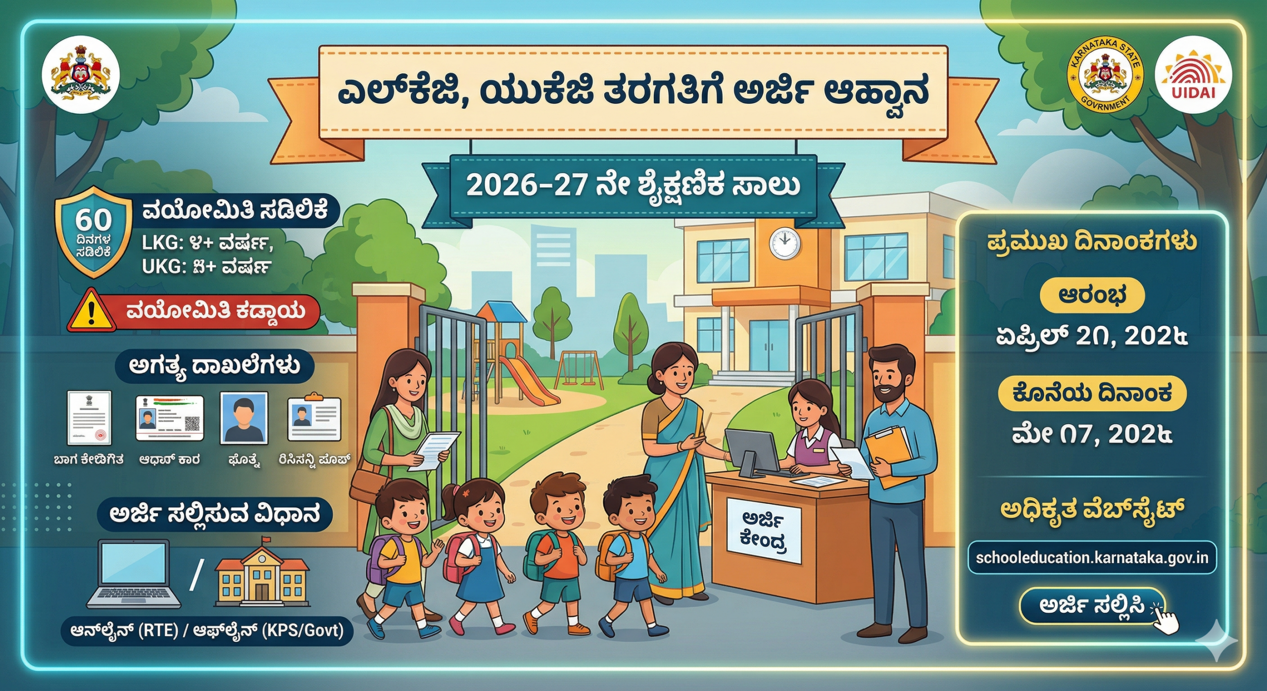 ಕರ್ನಾಟಕ ರಾಜ್ಯದಾದ್ಯಂತ 2026-27ನೇ ಸಾಲಿನ ಶೈಕ್ಷಣಿಕ ವರ್ಷಕ್ಕೆ ಎಲ್ಕೆಜಿ ಮತ್ತು ಯುಕೆಜಿ ತರಗತಿಗಳಿಗೆ ಪ್ರವೇಶಾತಿ ಪ್ರಕ್ರಿಯೆಯು ಅಧಿಕೃತವಾಗಿ ಚಾಲನೆಗೊಂಡಿದೆ. ಪೂರ್ವ ಪ್ರಾಥಮಿಕ ಶಿಕ್ಷಣವು ಮಗುವಿನ ಕಲಿಕೆಯ ಬುನಾದಿಯಾಗಿದ್ದು, ಸರಿಯಾದ ಸಮಯದಲ್ಲಿ ಸರಿಯಾದ ಶಾಲೆಗೆ ಮಗುವನ್ನು ಸೇರಿಸುವುದು ಪ್ರತಿಯೊಬ್ಬ ಪೋಷಕರ ಜವಾಬ್ದಾರಿಯಾಗಿದೆ. ಶಿಕ್ಷಣ ಇಲಾಖೆಯು ಇತ್ತೀಚಿನ ವರ್ಷಗಳಲ್ಲಿ ಪೂರ್ವ ಪ್ರಾಥಮಿಕ ಶಿಕ್ಷಣಕ್ಕೆ ಹೆಚ್ಚಿನ ಆದ್ಯತೆ ನೀಡುತ್ತಿದ್ದು, ಸರ್ಕಾರಿ ಶಾಲೆಗಳಲ್ಲಿಯೂ ಗುಣಮಟ್ಟದ ಎಲ್ಕೆಜಿ ಮತ್ತು ಯುಕೆಜಿ ತರಗತಿಗಳನ್ನು ಆರಂಭಿಸಲಾಗಿದೆ. ಈ ಹಿನ್ನೆಲೆಯಲ್ಲಿ ಪ್ರವೇಶಾತಿಯ ನಿಯಮಗಳು, ವಯೋಮಿತಿ ಮತ್ತು ಅಗತ್ಯ ದಾಖಲೆಗಳ ಬಗ್ಗೆ ಪೂರ್ಣ ಮಾಹಿತಿ ತಿಳಿದಿರುವುದು ಅತ್ಯಗತ್ಯ.