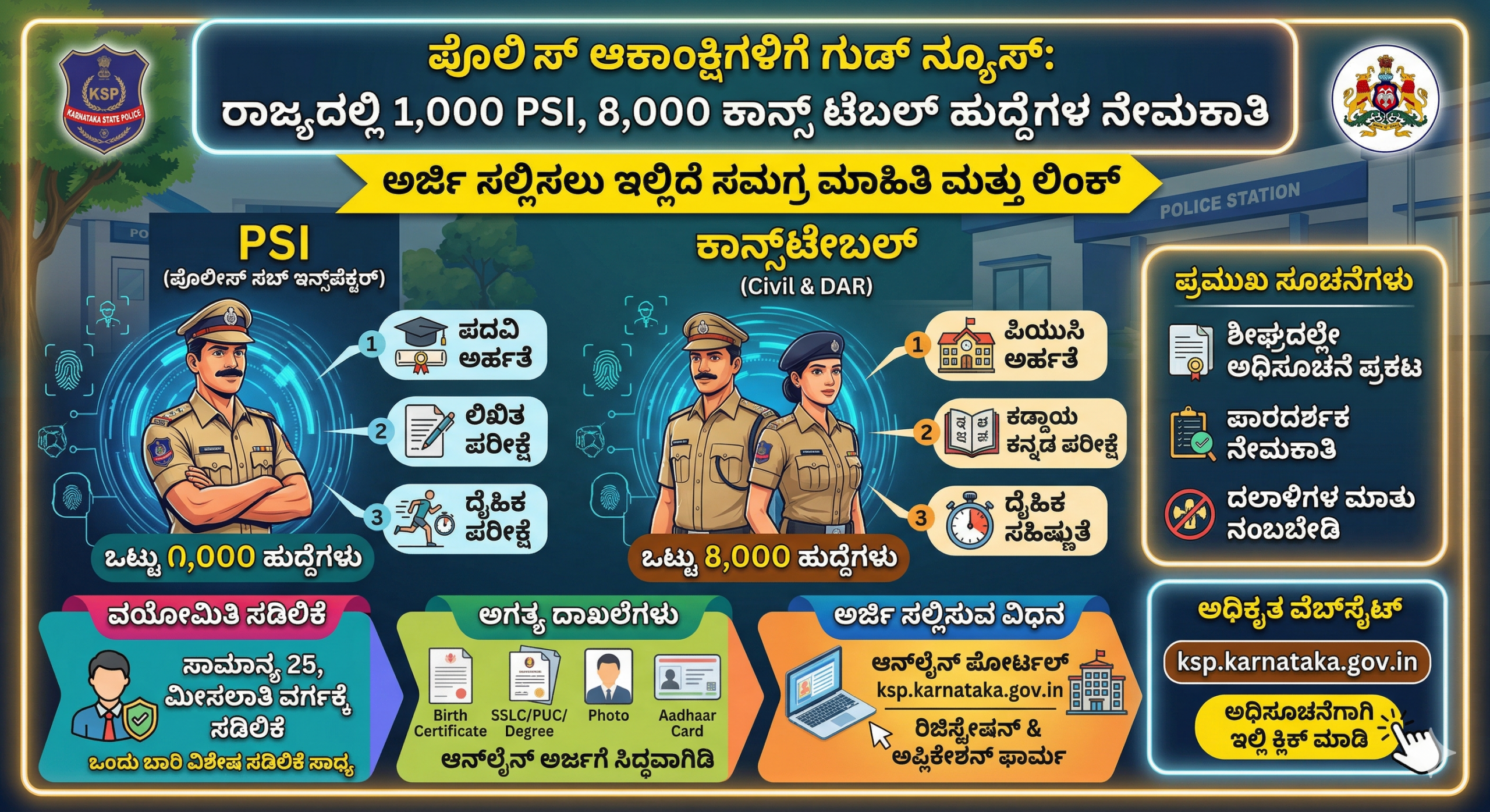 ಕರ್ನಾಟಕ ರಾಜ್ಯದಲ್ಲಿ ಪೊಲೀಸ್ ಇಲಾಖೆಗೆ ಸೇರಬಯಸುವ ಸಾವಿರಾರು ಯುವಕ-ಯುವತಿಯರಿಗೆ ರಾಜ್ಯ ಸರ್ಕಾರವು ಈ ವರ್ಷದ ಬಹುದೊಡ್ಡ ಉದ್ಯೋಗ ಸುದ್ದಿಯನ್ನು ನೀಡಿದೆ. ರಾಜ್ಯದ ಕಾನೂನು ಮತ್ತು ಸುವ್ಯವಸ್ಥೆಯನ್ನು ಮತ್ತಷ್ಟು ಬಲಪಡಿಸುವ ಉದ್ದೇಶದಿಂದ ಗೃಹ ಇಲಾಖೆಯು ಸುಮಾರು 1,000 ಪೊಲೀಸ್ ಸಬ್ ಇನ್ಸ್ಪೆಕ್ಟರ್ (PSI) ಮತ್ತು 8,000 ಪೊಲೀಸ್ ಕಾನ್ಸ್ಟೇಬಲ್ (Civil & DAR) ಹುದ್ದೆಗಳ ಬೃಹತ್ ನೇಮಕಾತಿಗೆ ಹಸಿರು ನಿಶಾನೆ ತೋರಿಸಿದೆ. ಕಳೆದ ಕೆಲವು ವರ್ಷಗಳಿಂದ ನೇಮಕಾತಿ ಪ್ರಕ್ರಿಯೆಯಲ್ಲಿ ಉಂಟಾಗಿದ್ದ ಅಡೆತಡೆಗಳು ಮತ್ತು ವಿಳಂಬಕ್ಕೆ ಮುಕ್ತಿ ಹಾಡಿರುವ ಸರ್ಕಾರ, ಈಗ ಅತ್ಯಂತ ಪಾರದರ್ಶಕ ಮತ್ತು ವೇಗದ ಗತಿಯಲ್ಲಿ ಈ ನೇಮಕಾತಿ ಪ್ರಕ್ರಿಯೆಯನ್ನು ಪೂರ್ಣಗೊಳಿಸಲು ನಿರ್ಧರಿಸಿದೆ. ಈ ಸುದ್ದಿಯು ರಾಜ್ಯದ ಮೂಲೆ ಮೂಲೆಯಲ್ಲಿರುವ ಸ್ಪರ್ಧಾತ್ಮಕ ಪರೀಕ್ಷಾರ್ಥಿಗಳಲ್ಲಿ ಹೊಸ ಉತ್ಸಾಹ ಮತ್ತು ಭರವಸೆಯನ್ನು ತುಂಬಿದ್ದು, ಅಭ್ಯಾಸದ ಕಡೆಗೆ ಹೆಚ್ಚಿನ ಗಮನ ಹರಿಸಲು ಪ್ರೇರೇಪಿಸಿದೆ.