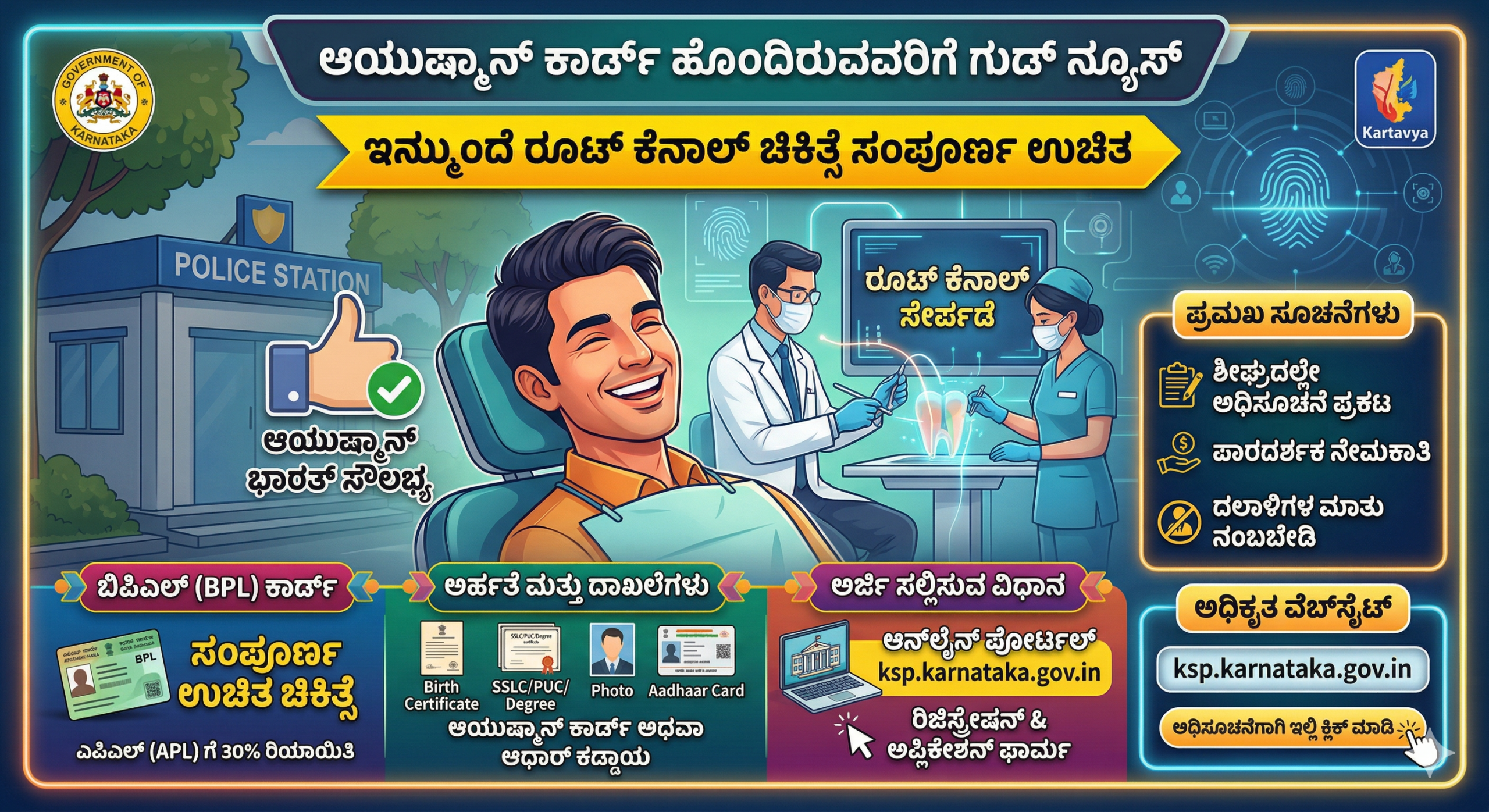 ಕರ್ನಾಟಕ ರಾಜ್ಯದ ಸಾಮಾನ್ಯ ಮತ್ತು ಮಧ್ಯಮ ವರ್ಗದ ಜನತೆಗೆ ಆರೋಗ್ಯ ಕ್ಷೇತ್ರದಲ್ಲಿ ಸರ್ಕಾರವು ಮತ್ತೊಂದು ಸಿಹಿ ಸುದ್ದಿಯನ್ನು ನೀಡಿದೆ. ಕೇಂದ್ರ ಮತ್ತು ರಾಜ್ಯ ಸರ್ಕಾರಗಳ ಸಹಭಾಗಿತ್ವದ ‘ಆಯುಷ್ಮಾನ್ ಭಾರತ್-ಆರೋಗ್ಯ ಕರ್ನಾಟಕ’ (AB-ARK) ಯೋಜನೆಯ ವ್ಯಾಪ್ತಿಯನ್ನು ಮತ್ತಷ್ಟು ವಿಸ್ತರಿಸಲಾಗಿದ್ದು, ಈ ಹಿಂದೆ ಕೇವಲ ಶಸ್ತ್ರಚಿಕಿತ್ಸೆ ಮತ್ತು ಗಂಭೀರ ಕಾಯಿಲೆಗಳಿಗೆ ಸೀಮಿತವಾಗಿದ್ದ ಈ ಯೋಜನೆಯಡಿ ಈಗ ದಂತ ಚಿಕಿತ್ಸೆಯ ಅತ್ಯಂತ ದುಬಾರಿ ಪ್ರಕ್ರಿಯೆಯಾದ ‘ರೂಟ್ ಕೆನಾಲ್’ (Root Canal Treatment) ಚಿಕಿತ್ಸೆಯನ್ನು ಸೇರ್ಪಡಿಸಲಾಗಿದೆ. ಹಲ್ಲು ನೋವು ಮತ್ತು ದಂತ ಕುಳಿಯ ಸಮಸ್ಯೆಯಿಂದ ಬಳಲುತ್ತಿರುವ ಸಾವಿರಾರು ಜನರಿಗೆ ಖಾಸಗಿ ಆಸ್ಪತ್ರೆಗಳಲ್ಲಿ ಸಾವಿರಾರು ರೂಪಾಯಿ ವೆಚ್ಚವಾಗುತ್ತಿದ್ದ ಈ ಚಿಕಿತ್ಸೆಯು ಈಗ ಸರ್ಕಾರಿ ಮತ್ತು ಆಯ್ದ ಅನುಬಂಧಿತ ಖಾಸಗಿ ಆಸ್ಪತ್ರೆಗಳಲ್ಲಿ ಉಚಿತವಾಗಿ ಅಥವಾ ಅತ್ಯಂತ ರಿಯಾಯಿತಿ ದರದಲ್ಲಿ ಲಭ್ಯವಾಗಲಿದೆ. ಇದು ರಾಜ್ಯದ ಬಡ ಮತ್ತು ಕೆಳ ಮಧ್ಯಮ ವರ್ಗದ ಜನರ ಆರ್ಥಿಕ ಹೊರೆಯನ್ನು ಕಡಿಮೆ ಮಾಡುವಲ್ಲಿ ಪ್ರಮುಖ ಪಾತ್ರ ವಹಿಸಲಿದೆ.