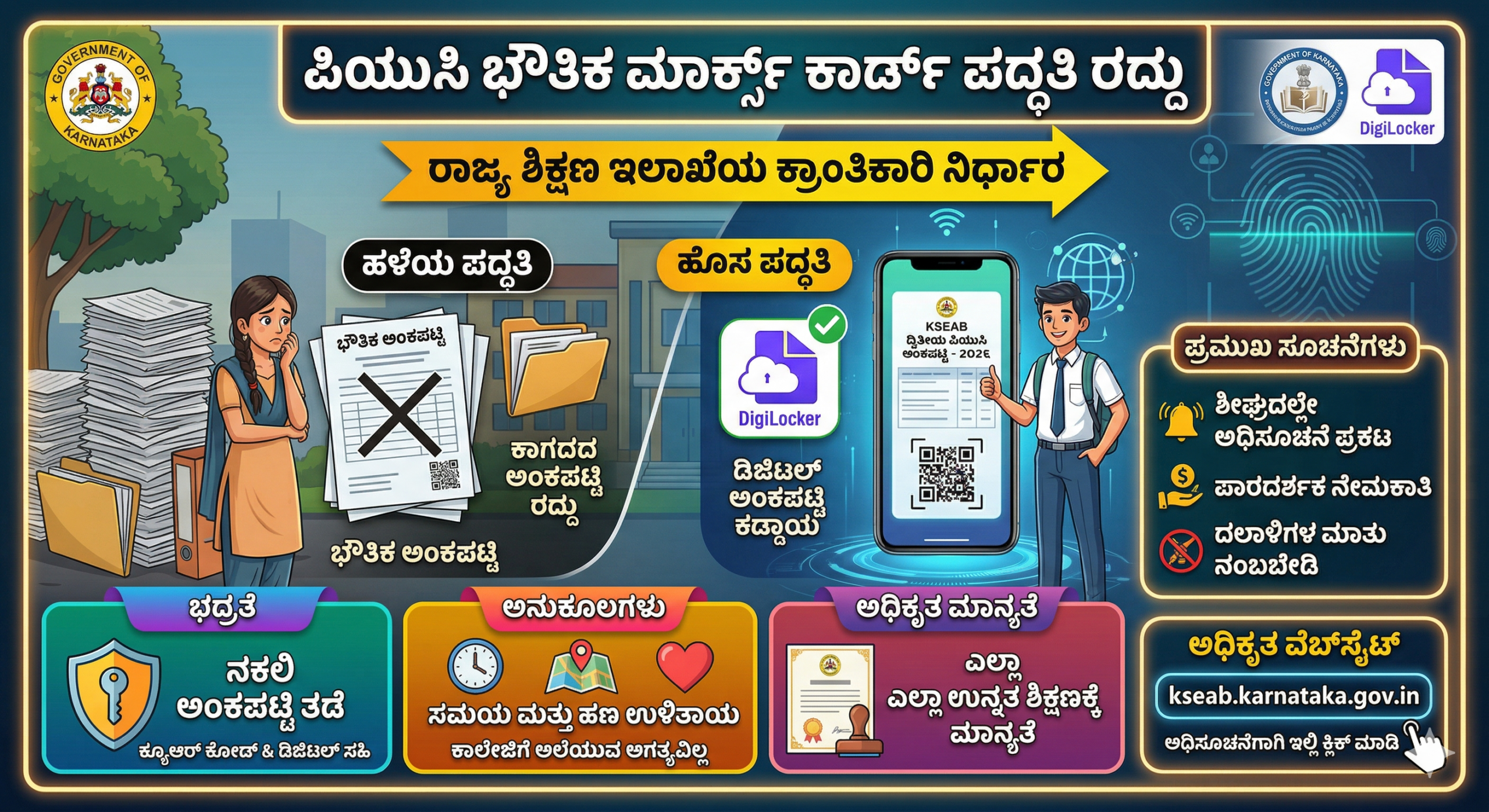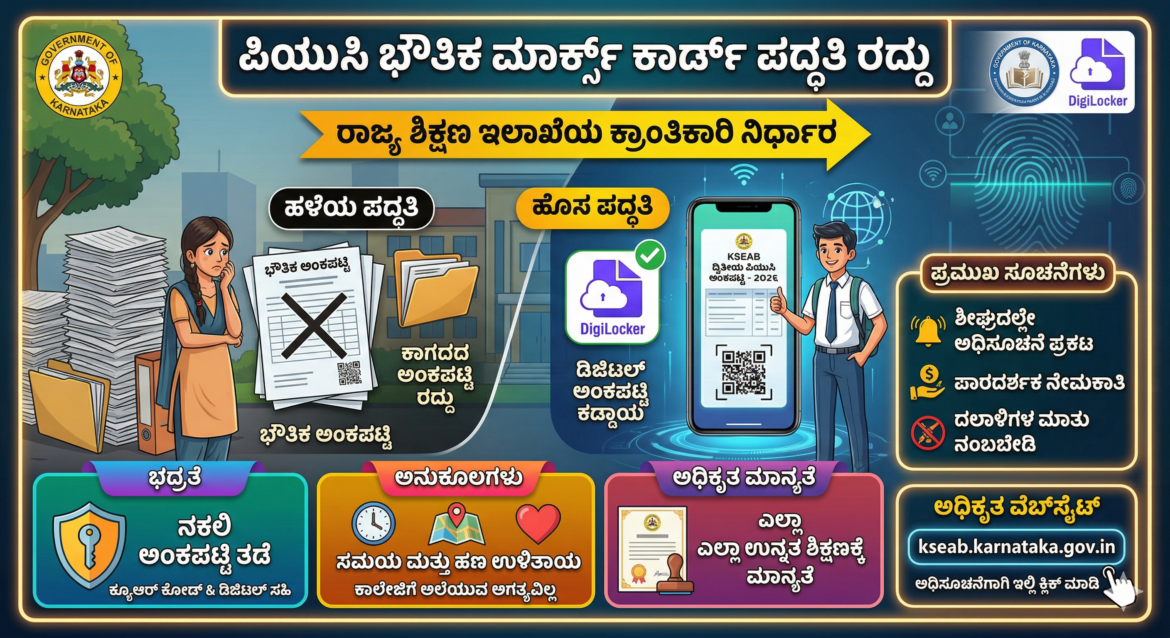 ಕರ್ನಾಟಕ ಶಾಲಾ ಪರೀಕ್ಷೆ ಮತ್ತು ಮೌಲ್ಯನಿರ್ಣಯ ಮಂಡಳಿಯು (KSEAB) ರಾಜ್ಯದ ಶಿಕ್ಷಣ ವ್ಯವಸ್ಥೆಯಲ್ಲಿ ಐತಿಹಾಸಿಕ ಮತ್ತು ಕ್ರಾಂತಿಕಾರಿ ಬದಲಾವಣೆಯೊಂದನ್ನು ಜಾರಿಗೆ ತಂದಿದ್ದು, ದ್ವಿತೀಯ ಪಿಯುಸಿ ವಿದ್ಯಾರ್ಥಿಗಳಿಗೆ ದಶಕಗಳಿಂದ ನೀಡಲಾಗುತ್ತಿದ್ದ ಭೌತಿಕ ಅಂಕಪಟ್ಟಿ (Physical Marks Card) ವಿತರಿಸುವ ಪದ್ಧತಿಯನ್ನು ಸಂಪೂರ್ಣವಾಗಿ ರದ್ದುಗೊಳಿಸಲು ನಿರ್ಧರಿಸಿದೆ. ಡಿಜಿಟಲ್ ಇಂಡಿಯಾ ಅಭಿಯಾನಕ್ಕೆ ಪೂರಕವಾಗಿ ಮತ್ತು ಆಡಳಿತಾತ್ಮಕ ಪಾರದರ್ಶಕತೆಯನ್ನು ಹೆಚ್ಚಿಸುವ ಉದ್ದೇಶದಿಂದ ಕೈಗೊಂಡಿರುವ ಈ ನಿರ್ಧಾರವು ಶಿಕ್ಷಣ ಕ್ಷೇತ್ರದಲ್ಲಿ ದೊಡ್ಡ ಸಂಚಲನ ಮೂಡಿಸಿದೆ. ಇನ್ನು ಮುಂದೆ ಪಿಯುಸಿ ವಿದ್ಯಾರ್ಥಿಗಳಿಗೆ ಕಾಗದದ ರೂಪದ ಅಂಕಪಟ್ಟಿಗಳ ಬದಲಿಗೆ ಡಿಜಿಟಲ್ ಅಂಕಪಟ್ಟಿಗಳನ್ನು ಮಾತ್ರ ನೀಡಲಾಗುವುದು. ಈ ಮೂಲಕ ಅಂಕಪಟ್ಟಿಗಳ ಮುದ್ರಣ, ಸಾಗಾಟ ಮತ್ತು ಸಂಗ್ರಹಣೆಯಲ್ಲಾಗುತ್ತಿದ್ದ ಭಾರಿ ವೆಚ್ಚ ಮತ್ತು ಸಮಯದ ವ್ಯರ್ಥವನ್ನು ತಡೆಯಲು ಸರ್ಕಾರ ಮುಂದಾಗಿದೆ. ಈ ಹೊಸ ವ್ಯವಸ್ಥೆಯು ಕೇವಲ ತಾಂತ್ರಿಕ ಬದಲಾವಣೆಯಲ್ಲ, ಬದಲಿಗೆ ನಕಲಿ ಅಂಕಪಟ್ಟಿಗಳ ಹಾವಳಿಗೆ ಶಾಶ್ವತವಾಗಿ ಬ್ರೇಕ್ ಹಾಕುವ ದೀರ್ಘಕಾಲದ ಯೋಜನೆಯಾಗಿದೆ.