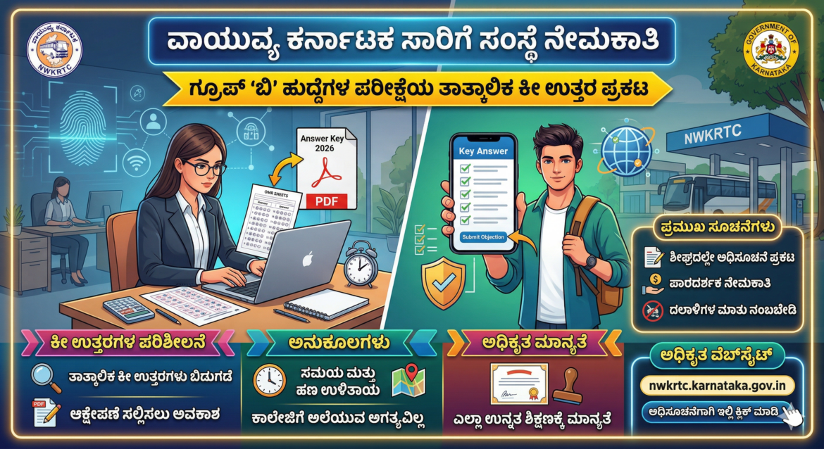 ವಾಯುವ್ಯ ಕರ್ನಾಟಕ ರಸ್ತೆ ಸಾರಿಗೆ ಸಂಸ್ಥೆಯು (NWKRTC) ಖಾಲಿ ಇರುವ ವಿವಿಧ ಗ್ರೂಪ್ ‘ಬಿ’ (Group B) ವೃಂದದ ಅಧಿಕಾರಿ ಹುದ್ದೆಗಳ ನೇಮಕಾತಿ ಪ್ರಕ್ರಿಯೆಯಲ್ಲಿ ಮತ್ತೊಂದು ಪ್ರಮುಖ ಘಟ್ಟವನ್ನು ತಲುಪಿದ್ದು, ಇತ್ತೀಚೆಗಷ್ಟೇ ನಡೆಸಲಾದ ಸ್ಪರ್ಧಾತ್ಮಕ ಪರೀಕ್ಷೆಯ ತಾತ್ಕಾಲಿಕ ಕೀ ಉತ್ತರಗಳನ್ನು (Provisional Answer Keys) ಅಧಿಕೃತವಾಗಿ ಪ್ರಕಟಿಸಿದೆ. ಸಾರಿಗೆ ಸಂಸ್ಥೆಯಲ್ಲಿನ ಆಡಳಿತಾತ್ಮಕ ವಿಭಾಗಗಳನ್ನು ಬಲಪಡಿಸಲು ಮತ್ತು ಕಾರ್ಯಕ್ಷಮತೆಯನ್ನು ಹೆಚ್ಚಿಸಲು ಈ ನೇಮಕಾತಿಯನ್ನು ಕೈಗೊಳ್ಳಲಾಗಿದ್ದು, ಪರೀಕ್ಷೆ ಬರೆದ ಸಾವಿರಾರು ಅಭ್ಯರ್ಥಿಗಳು ತಮ್ಮ ಫಲಿತಾಂಶದ ನಿರೀಕ್ಷೆಯಲ್ಲಿದ್ದರು. ಈಗ ಕೀ ಉತ್ತರಗಳು ಬಿಡುಗಡೆಯಾಗಿರುವುದರಿಂದ, ಅಭ್ಯರ್ಥಿಗಳು ತಾವು ಪರೀಕ್ಷೆಯಲ್ಲಿ ನೀಡಿದ ಉತ್ತರಗಳನ್ನು ಅಧಿಕೃತ ಕೀಲಿ ಕೈಗಳೊಂದಿಗೆ ತಾಳೆ ನೋಡಿಕೊಳ್ಳಲು ಮತ್ತು ತಮ್ಮ ಸಂಭವನೀಯ ಅಂಕಗಳನ್ನು ಲೆಕ್ಕ ಹಾಕಲು ಅವಕಾಶ ಕಲ್ಪಿಸಲಾಗಿದೆ. ಇದು ನೇಮಕಾತಿ ಪ್ರಕ್ರಿಯೆಯಲ್ಲಿ ಪಾರದರ್ಶಕತೆಯನ್ನು ಕಾಪಾಡುವ ದೃಷ್ಟಿಯಿಂದ ಸಂಸ್ಥೆಯು ಕೈಗೊಂಡಿರುವ ಅತ್ಯಂತ ಮಹತ್ವದ ಕ್ರಮವಾಗಿದೆ.