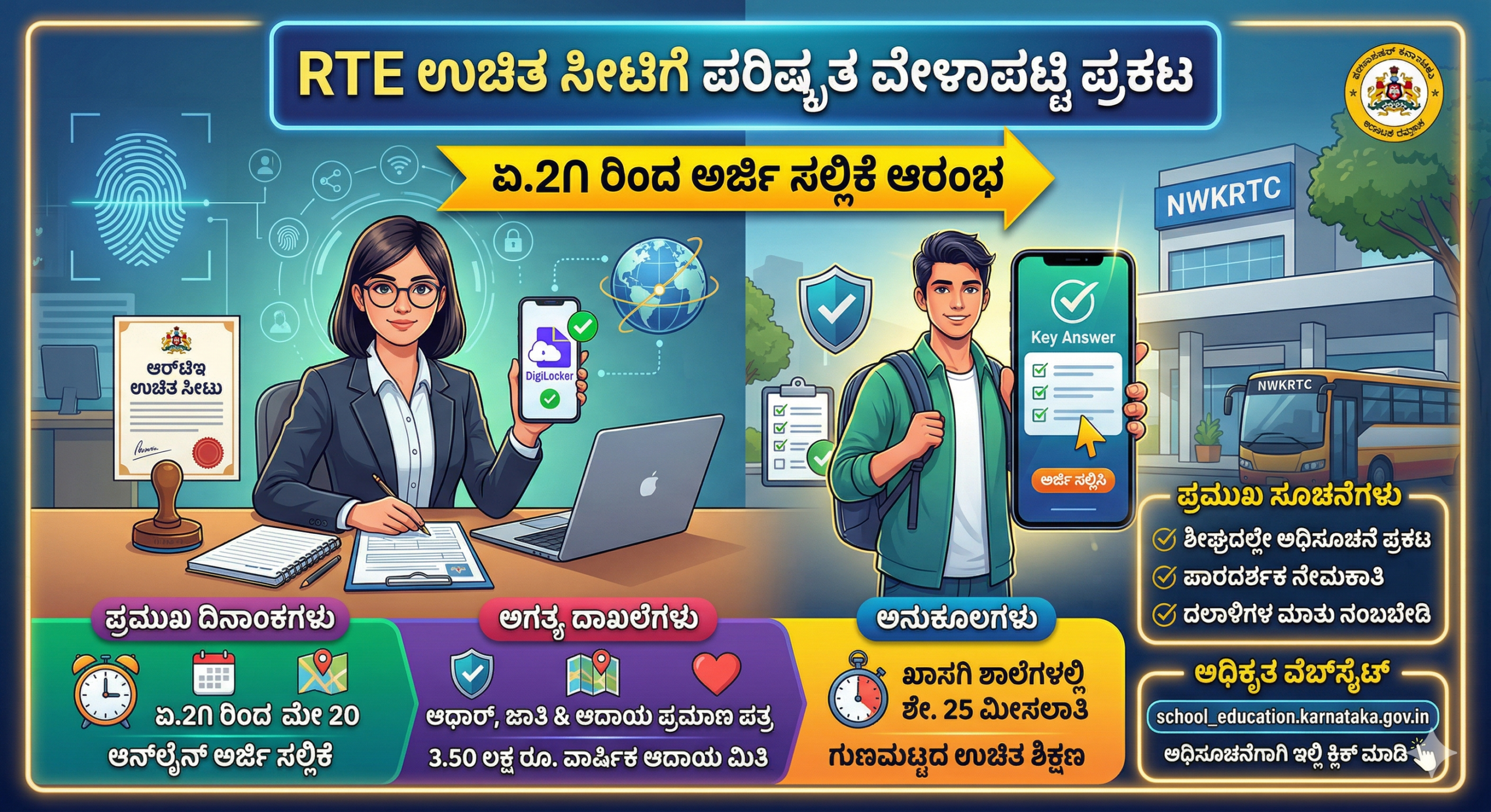 ಕರ್ನಾಟಕ ರಾಜ್ಯ ಶಿಕ್ಷಣ ಇಲಾಖೆಯು ಶಿಕ್ಷಣ ಹಕ್ಕು ಕಾಯ್ದೆಯಡಿ (RTE) ಉಚಿತ ಸೀಟುಗಳ ಪ್ರವೇಶಾತಿಗಾಗಿ ಕಾಯುತ್ತಿದ್ದ ಪೋಷಕರಿಗೆ ಪ್ರಮುಖ ಸುದ್ದಿಯೊಂದನ್ನು ನೀಡಿದೆ. 2026-27ನೇ ಶೈಕ್ಷಣಿಕ ಸಾಲಿನ ಆರ್ಟಿಇ ಪ್ರವೇಶ ಪ್ರಕ್ರಿಯೆಗೆ ಸಂಬಂಧಿಸಿದಂತೆ ಪರಿಷ್ಕೃತ ವೇಳಾಪಟ್ಟಿಯನ್ನು ಅಧಿಕೃತವಾಗಿ ಪ್ರಕಟಿಸಲಾಗಿದ್ದು, ಏಪ್ರಿಲ್ 21 ರಿಂದ ಆನ್ಲೈನ್ ಮೂಲಕ ಅರ್ಜಿ ಸಲ್ಲಿಕೆ ಪ್ರಕ್ರಿಯೆ ಅಧಿಕೃತವಾಗಿ ಆರಂಭವಾಗಲಿದೆ. ಆರ್ಥಿಕವಾಗಿ ಹಿಂದುಳಿದ ಮತ್ತು ದುರ್ಬಲ ವರ್ಗದ ಮಕ್ಕಳಿಗೆ ಪ್ರತಿಷ್ಠಿತ ಖಾಸಗಿ ಅನುದಾನರಹಿತ ಶಾಲೆಗಳಲ್ಲಿ ಶೇ. 25 ರಷ್ಟು ಮೀಸಲಾತಿಯಡಿ ಉಚಿತ ಶಿಕ್ಷಣ ನೀಡುವ ಈ ಯೋಜನೆಯು ಬಡ ಪೋಷಕರಿಗೆ ವರದಾನವಾಗಲಿದೆ. ಈ ಬಾರಿ ತಾಂತ್ರಿಕ ಕಾರಣಗಳಿಂದಾಗಿ ವೇಳಾಪಟ್ಟಿಯಲ್ಲಿ ಸಣ್ಣ ಬದಲಾವಣೆ ಮಾಡಲಾಗಿದ್ದು, ಪೋಷಕರು ನಿಗದಿತ ಅವಧಿಯೊಳಗೆ ಅಗತ್ಯ ದಾಖಲೆಗಳೊಂದಿಗೆ ಅರ್ಜಿ ಸಲ್ಲಿಸಲು ಸಿದ್ಧರಾಗಬೇಕೆಂದು ಶಿಕ್ಷಣ ಇಲಾಖೆ ಸೂಚಿಸಿದೆ.