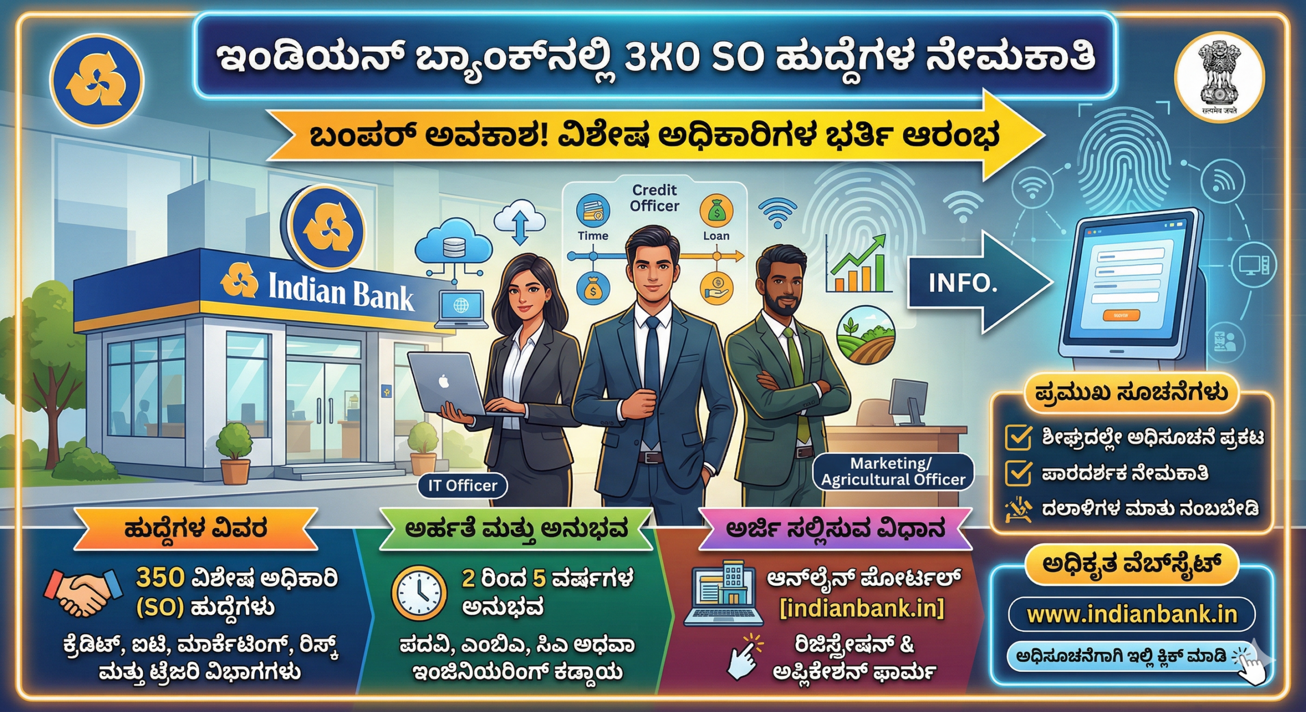 ಭಾರತೀಯ ಬ್ಯಾಂಕಿಂಗ್ ಕ್ಷೇತ್ರದಲ್ಲಿ ವೃತ್ತಿಜೀವನವನ್ನು ರೂಪಿಸಿಕೊಳ್ಳಲು ಬಯಸುವ ಅಭ್ಯರ್ಥಿಗಳಿಗೆ ಸಾರ್ವಜನಿಕ ವಲಯದ ಪ್ರಮುಖ ಬ್ಯಾಂಕ್ಗಳಲ್ಲಿ ಒಂದಾದ ಇಂಡಿಯನ್ ಬ್ಯಾಂಕ್ (Indian Bank) ಅತ್ಯುತ್ತಮ ಅವಕಾಶವನ್ನು ಕಲ್ಪಿಸಿದೆ. ಬ್ಯಾಂಕ್ ತನ್ನ ವಿವಿಧ ವಿಭಾಗಗಳಲ್ಲಿ ಖಾಲಿ ಇರುವ ಸ್ಪೆಷಲಿಸ್ಟ್ ಆಫೀಸರ್ (Specialist Officer – SO) ಹುದ್ದೆಗಳ ಭರ್ತಿಗಾಗಿ ಅಧಿಕೃತ ನೇಮಕಾತಿ ಅಧಿಸೂಚನೆಯನ್ನು ಹೊರಡಿಸಿದೆ. ಒಟ್ಟು 350 ಹುದ್ದೆಗಳಿಗೆ ಅರ್ಹ ಅಭ್ಯರ್ಥಿಗಳಿಂದ ಅರ್ಜಿಗಳನ್ನು ಆಹ್ವಾನಿಸಲಾಗಿದ್ದು, ವಿವಿಧ ತಾಂತ್ರಿಕ ಮತ್ತು ಆಡಳಿತಾತ್ಮಕ ಹಿನ್ನೆಲೆ ಹೊಂದಿರುವ ವೃತ್ತಿಪರರಿಗೆ ಇದು ಒಂದು ಸುವರ್ಣ ಅವಕಾಶವಾಗಿದೆ. ಈ ನೇಮಕಾತಿಯು ಸ್ಕೇಲ್-I ರಿಂದ ಸ್ಕೇಲ್-IV ವರೆಗಿನ ವಿವಿಧ ಹಂತದ ಅಧಿಕಾರಿ ಹುದ್ದೆಗಳನ್ನು ಒಳಗೊಂಡಿದ್ದು, ಆಯ್ಕೆಯಾದ ಅಭ್ಯರ್ಥಿಗಳಿಗೆ ಆಕರ್ಷಕ ವೇತನ ಶ್ರೇಣಿ ಮತ್ತು ಭದ್ರತೆಯುಳ್ಳ ಉದ್ಯೋಗ ದೊರೆಯಲಿದೆ. ಬ್ಯಾಂಕಿಂಗ್ ಕ್ಷೇತ್ರದಲ್ಲಿ ವಿಶೇಷ ಕೌಶಲ್ಯ ಹೊಂದಿರುವವರಿಗೆ ಮತ್ತು ಅನುಭವಿಗಳಿಗೆ ಈ ನೇಮಕಾತಿಯಲ್ಲಿ ಹೆಚ್ಚಿನ ಆದ್ಯತೆ ನೀಡಲಾಗುತ್ತಿದೆ.