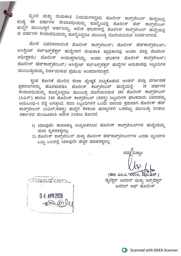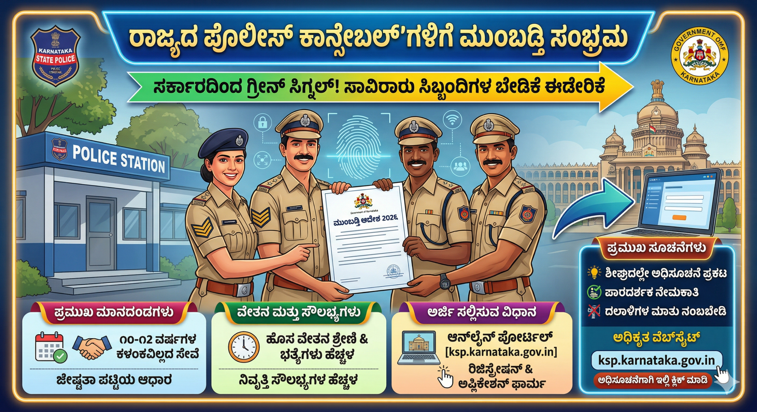 ರಾಜ್ಯ ಪೊಲೀಸ್ ಇಲಾಖೆಯಲ್ಲಿ ಕಾನ್ಸ್ಟೇಬಲ್ಗಳ ಸಂಖ್ಯೆ ಅತ್ಯಂತ ಹೆಚ್ಚಿದೆ, ಆದರೆ ಅವರಿಗೆ ನಿಗದಿತ ಸಮಯದಲ್ಲಿ ಬಡ್ತಿ ಸಿಗುತ್ತಿರಲಿಲ್ಲ ಎಂಬುದು ದೊಡ್ಡ ಅಸಮಾಧಾನವಾಗಿತ್ತು. ಹಲವು ಸಿಬ್ಬಂದಿಗಳು ಹದಿನೈದು ಅಥವಾ ಇಪ್ಪತ್ತು ವರ್ಷಗಳ ಕಾಲ ಒಂದೇ ಹುದ್ದೆಯಲ್ಲಿ ಕೆಲಸ ಮಾಡುತ್ತಿದ್ದರು. ಇದನ್ನು ಗಂಭೀರವಾಗಿ ಪರಿಗಣಿಸಿದ ಸರ್ಕಾರವು, ಪೊಲೀಸ್ ಸಿಬ್ಬಂದಿಗಳ ಕಲ್ಯಾಣಕ್ಕಾಗಿ ರಚಿಸಲಾಗಿದ್ದ ವಿವಿಧ ಸಮಿತಿಗಳ ವರದಿಯನ್ನು ಆಧರಿಸಿ ಈಗ ಬೃಹತ್ ಪ್ರಮಾಣದ ಬಡ್ತಿ ಪ್ರಕ್ರಿಯೆಗೆ ಮುಂದಾಗಿದೆ. ಮುಖ್ಯಮಂತ್ರಿಗಳು ಮತ್ತು ಗೃಹ ಸಚಿವರ ನೇತೃತ್ವದಲ್ಲಿ ನಡೆದ ಉನ್ನತ ಮಟ್ಟದ ಸಭೆಯಲ್ಲಿ, ಖಾಲಿ ಇರುವ ಹೆಡ್ ಕಾನ್ಸ್ಟೇಬಲ್ (Head Constable) ಮತ್ತು ಸೈಕಲ್ ಇನ್ಸ್ಪೆಕ್ಟರ್ (ASI) ಹುದ್ದೆಗಳನ್ನು ಬಡ್ತಿಯ ಮೂಲಕ ಭರ್ತಿ ಮಾಡಲು ಅನುಮೋದನೆ ನೀಡಲಾಗಿದೆ. ಈ ಪ್ರಕ್ರಿಯೆಯು ಜಿಲ್ಲಾ ಮಟ್ಟದ ಪೊಲೀಸ್ ವರಿಷ್ಠಾಧಿಕಾರಿಗಳ ಕಚೇರಿಯಿಂದಲೇ ನಿರ್ವಹಿಸಲ್ಪಡಲಿದ್ದು, ಜೇಷ್ಟತಾ ಪಟ್ಟಿಯ (Seniority List) ಆಧಾರದ ಮೇಲೆ ಅರ್ಹರನ್ನು ಗುರುತಿಸಲಾಗುತ್ತಿದೆ.