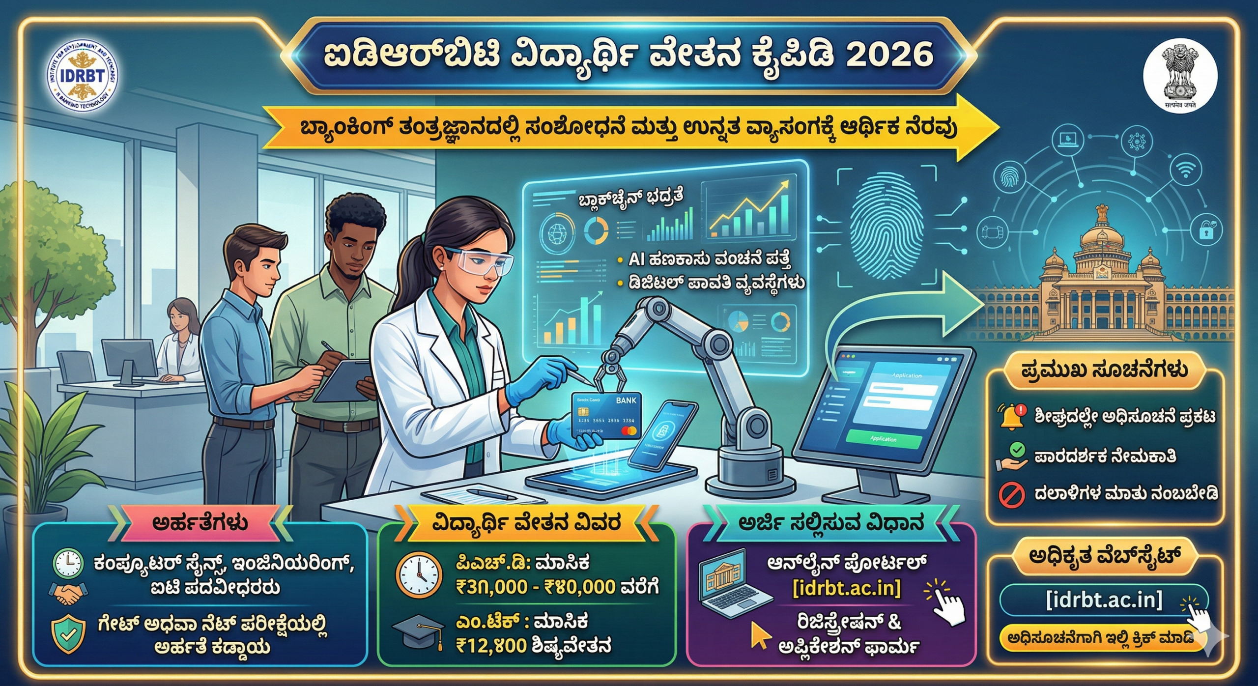ಭಾರತೀಯ ಬ್ಯಾಂಕಿಂಗ್ ಕ್ಷೇತ್ರದಲ್ಲಿ ತಾಂತ್ರಿಕ ಸುಧಾರಣೆ ಮತ್ತು ಸಂಶೋಧನೆಯನ್ನು ಉತ್ತೇಜಿಸುವ ನಿಟ್ಟಿನಲ್ಲಿ ಐಡಿಆರ್ಬಿಟಿ (Institute for Development and Research in Banking Technology) ಸಂಸ್ಥೆಯು ಅತ್ಯಂತ ಪ್ರತಿಷ್ಠಿತ ವಿದ್ಯಾರ್ಥಿ ವೇತನ ಯೋಜನೆಯನ್ನು ಜಾರಿಗೆ ತಂದಿದೆ. ರಿಸರ್ವ್ ಬ್ಯಾಂಕ್ ಆಫ್ ಇಂಡಿಯಾ (RBI) ಸ್ಥಾಪಿಸಿದ ಈ ಸ್ವಾಯತ್ತ ಸಂಸ್ಥೆಯು ಹೈದರಾಬಾದ್ನಲ್ಲಿ ಪ್ರಧಾನ ಕಚೇರಿಯನ್ನು ಹೊಂದಿದ್ದು, ಬ್ಯಾಂಕಿಂಗ್ ತಂತ್ರಜ್ಞಾನದಲ್ಲಿ ಉನ್ನತ ವ್ಯಾಸಂಗ ಮತ್ತು ಸಂಶೋಧನೆ ನಡೆಸಲು ಬಯಸುವ ಪ್ರತಿಭಾವಂತ ವಿದ್ಯಾರ್ಥಿಗಳಿಗೆ ಆರ್ಥಿಕ ನೆರವು ನೀಡುತ್ತಿದೆ. ಡಿಜಿಟಲ್ ಪಾವತಿ ವ್ಯವಸ್ಥೆಗಳು, ಸೈಬರ್ ಭದ್ರತೆ, ಬ್ಲಾಕ್ಚೈನ್ ತಂತ್ರಜ್ಞಾನ ಮತ್ತು ಆರ್ಟಿಫಿಶಿಯಲ್ ಇಂಟೆಲಿಜೆನ್ಸ್ನಂತಹ ಆಧುನಿಕ ವಿಷಯಗಳಲ್ಲಿ ಸಂಶೋಧನೆ ನಡೆಸಲು ಈ ಕೈಪಿಡಿಯು ವಿದ್ಯಾರ್ಥಿಗಳಿಗೆ ದಾರಿದೀಪವಾಗಿದೆ. ಕೇವಲ ಹಣಕಾಸಿನ ನೆರವು ಮಾತ್ರವಲ್ಲದೆ, ದೇಶದ ಅಗ್ರಗಣ್ಯ ಬ್ಯಾಂಕಿಂಗ್ ತಜ್ಞರ ಮಾರ್ಗದರ್ಶನದಲ್ಲಿ ಕೆಲಸ ಮಾಡುವ ಅಮೂಲ್ಯ ಅವಕಾಶವನ್ನು ಈ ಯೋಜನೆ ಕಲ್ಪಿಸುತ್ತದೆ. ಇದುವರೆಗೆ ಸಾವಿರಾರು ಸಂಶೋಧಕರು ಈ ಯೋಜನೆಯ ಲಾಭ ಪಡೆದು ಜಾಗತಿಕ ಮಟ್ಟದ ಹಣಕಾಸು ಸಂಸ್ಥೆಗಳಲ್ಲಿ ಉನ್ನತ ಹುದ್ದೆಗಳನ್ನು ಅಲಂಕರಿಸಿದ್ದಾರೆ.