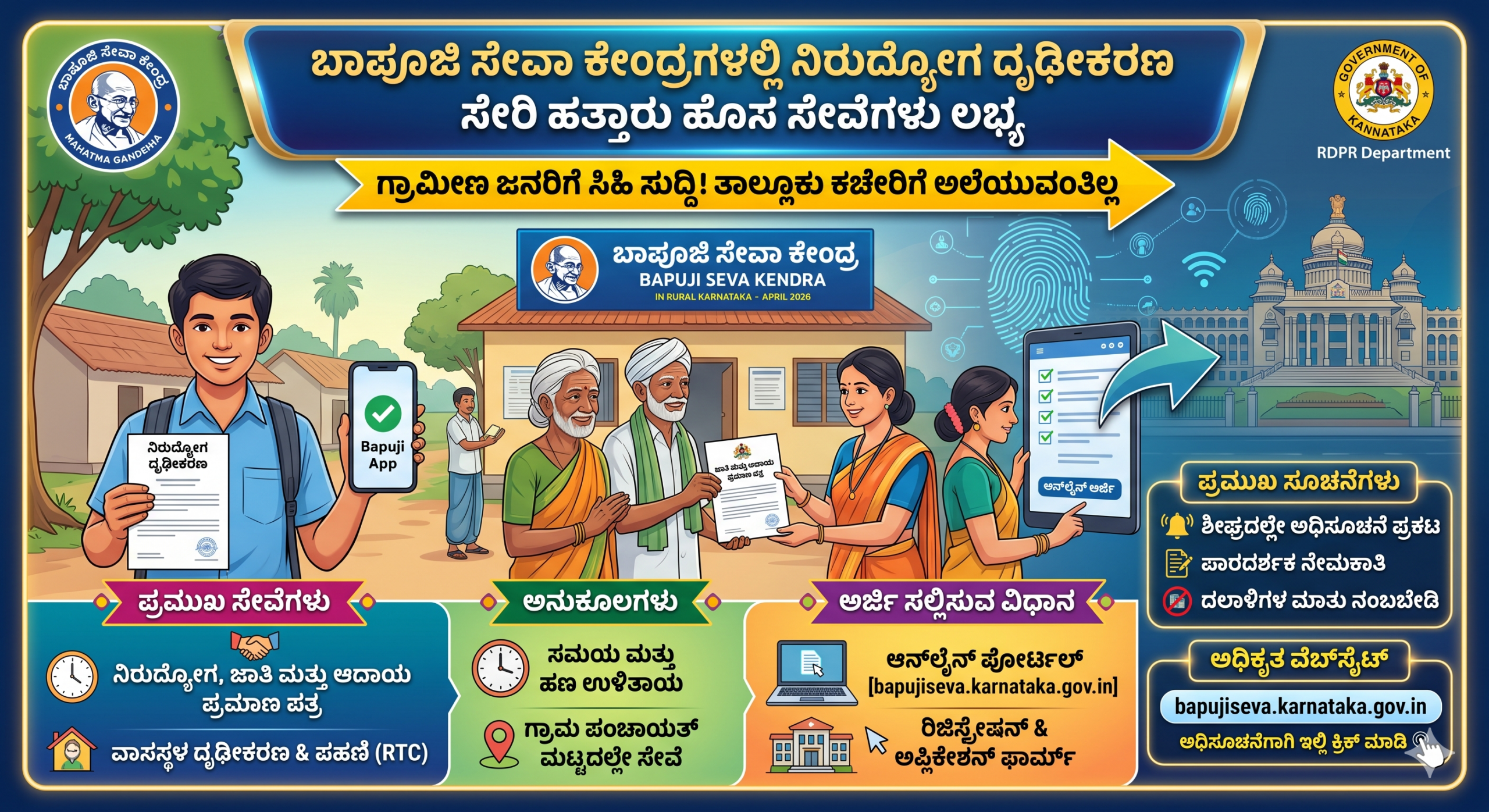 ಕೊನೆಯದಾಗಿ, ರಾಜ್ಯದ ಪ್ರತಿಯೊಬ್ಬ ಗ್ರಾಮೀಣ ನಿವಾಸಿಯೂ ಈ ಬಾಪೂಜಿ ಸೇವಾ ಕೇಂದ್ರಗಳ ಬಗ್ಗೆ ಜಾಗೃತಿ ಹೊಂದಿರಬೇಕು. ಸಣ್ಣಪುಟ್ಟ ಕೆಲಸಗಳಿಗಾಗಿ ದಲ್ಲಾಳಿಗಳ ಮೊರೆ ಹೋಗುವ ಬದಲಿಗೆ, ಅಧಿಕೃತವಾಗಿ ಈ ಕೇಂದ್ರಗಳನ್ನು ಸಂಪರ್ಕಿಸುವುದು ಸುರಕ್ಷಿತ ಮತ್ತು ಕಾನೂನುಬದ್ಧವಾಗಿದೆ. ನಿರುದ್ಯೋಗ ದೃಢೀಕರಣದಂತಹ ಪ್ರಮುಖ ದಾಖಲೆಗಳು ಈಗ ನಿಮ್ಮ ಮನೆಯ ಬಾಗಿಲಿಗೇ ಬಂದಿರುವುದು ಗ್ರಾಮೀಣಾಭಿವೃದ್ಧಿಯ ಸಂಕೇತವಾಗಿದೆ. ಈ ಮಾಹಿತಿಯನ್ನು ನಿಮ್ಮ ಹಳ್ಳಿಯ ರೈತರು, ಯುವಕರು ಮತ್ತು ಮಹಿಳೆಯರೊಂದಿಗೆ ಹಂಚಿಕೊಳ್ಳುವ ಮೂಲಕ ಸರ್ಕಾರದ ಸೌಲಭ್ಯಗಳು ಪ್ರತಿಯೊಬ್ಬ ಅರ್ಹ ನಾಗರಿಕನಿಗೂ ತಲುಪುವಂತೆ ಮಾಡಿ. ಉತ್ತಮ ಮತ್ತು ಸುಲಭ ಆಡಳಿತವೇ ಪ್ರಜಾಪ್ರಭುತ್ವದ ಶಕ್ತಿಯಾಗಿದೆ. ಈ ಮೂಲಕ ಕರ್ನಾಟಕವು ಡಿಜಿಟಲ್ ಸೇವೆಗಳ ವಿತರಣೆಯಲ್ಲಿ ದೇಶದಲ್ಲೇ ಮಾದರಿ ರಾಜ್ಯವಾಗಿ ಹೊರಹೊಮ್ಮುತ್ತಿದೆ. ಹೆಚ್ಚಿನ ಮಾಹಿತಿಗಾಗಿ ನಿಮ್ಮ ಗ್ರಾಮ ಪಂಚಾಯತ್ ಕಚೇರಿಯನ್ನು ಇಂದೇ ಭೇಟಿ ಮಾಡಿ. ನಿಮ್ಮ ಹಕ್ಕುಗಳನ್ನು ಸರಿಯಾದ ಸಮಯದಲ್ಲಿ ಚಲಾಯಿಸಿ ಮತ್ತು ಉಜ್ವಲ ಭವಿಷ್ಯವನ್ನು ನಿರ್ಮಿಸಿಕೊಳ್ಳಿ.