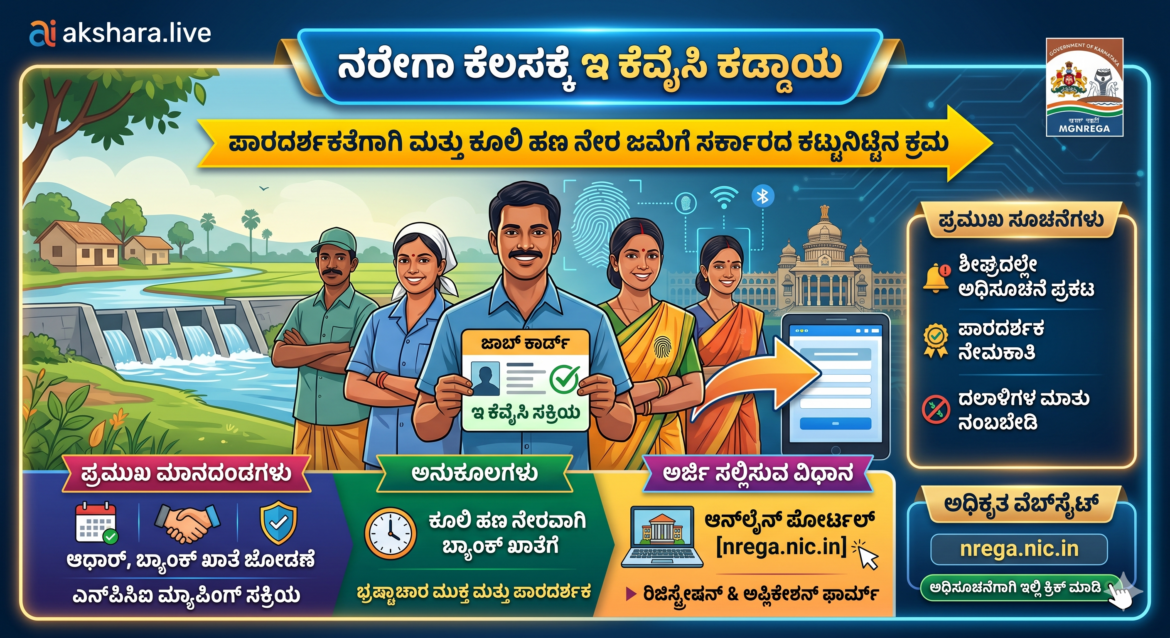 ಮಹಾತ್ಮ ಗಾಂಧಿ ರಾಷ್ಟ್ರೀಯ ಗ್ರಾಮೀಣ ಉದ್ಯೋಗ ಖಾತರಿ ಯೋಜನೆ (MGNREGA) ಅಡಿಯಲ್ಲಿ ಕೆಲಸ ಮಾಡುವ ರಾಜ್ಯದ ಲಕ್ಷಾಂತರ ಕೂಲಿ ಕಾರ್ಮಿಕರಿಗೆ ಕೇಂದ್ರ ಮತ್ತು ರಾಜ್ಯ ಸರ್ಕಾರಗಳು ಈಗ ಮಹತ್ವದ ಸೂಚನೆಯೊಂದನ್ನು ನೀಡಿವೆ. ನರೇಗಾ ಯೋಜನೆಯಡಿ ಪಾರದರ್ಶಕತೆ ತರಲು ಮತ್ತು ಕೂಲಿ ಹಣ ನೇರವಾಗಿ ಅರ್ಹ ಫಲಾನುಭವಿಗಳ ಖಾತೆಗೆ ಜಮೆಯಾಗುವುದನ್ನು ಖಚಿತಪಡಿಸಿಕೊಳ್ಳಲು ‘ಇ-ಕೆವೈಸಿ’ (e-KYC) ಪ್ರಕ್ರಿಯೆಯನ್ನು ಈಗ ಕಡ್ಡಾಯಗೊಳಿಸಲಾಗಿದೆ. ಇದುವರೆಗೆ ಕೇವಲ ಬ್ಯಾಂಕ್ ಖಾತೆ ಮತ್ತು ಆಧಾರ್ ಜೋಡಣೆಗೆ ಸೀಮಿತವಾಗಿದ್ದ ಈ ಪ್ರಕ್ರಿಯೆಯು ಈಗ ಮುಂದಿನ ಹಂತಕ್ಕೆ ತಲುಪಿದ್ದು, ಪ್ರತಿಯೊಬ್ಬ ಜಾಬ್ ಕಾರ್ಡ್ (Job Card) ಹೊಂದಿರುವ ಕಾರ್ಮಿಕರು ತಮ್ಮ ಆಧಾರ್ ವಿವರಗಳನ್ನು ಸಕ್ರಿಯಗೊಳಿಸುವುದು ಅನಿವಾರ್ಯವಾಗಿದೆ. ಈ ಕ್ರಮವು ಯೋಜನೆಯಲ್ಲಿ ನಡೆಯಬಹುದಾದ ಅಕ್ರಮಗಳನ್ನು ತಡೆಯಲು ಮತ್ತು ‘ಬೋಗಸ್’ ಕಾರ್ಡ್ಗಳನ್ನು ಪತ್ತೆಹಚ್ಚಲು ಸರ್ಕಾರಕ್ಕೆ ಸಹಕಾರಿಯಾಗಲಿದೆ. ಸರ್ಕಾರವು ನಿಗದಿಪಡಿಸಿದ ಕಾಲಮಿತಿಯೊಳಗೆ ಈ ಪ್ರಕ್ರಿಯೆಯನ್ನು ಪೂರ್ಣಗೊಳಿಸದಿದ್ದರೆ, ಕಾರ್ಮಿಕರು ಮುಂದಿನ ದಿನಗಳಲ್ಲಿ ಕೆಲಸ ಪಡೆಯಲು ಅಥವಾ ಕೆಲಸ ಮಾಡಿದ ಹಣವನ್ನು ಪಡೆಯಲು ತೊಂದರೆ ಅನುಭವಿಸಬೇಕಾಗಬಹುದು ಎಂದು ಗ್ರಾಮೀಣಾಭಿವೃದ್ಧಿ ಮತ್ತು ಪಂಚಾಯತ್ ರಾಜ್ ಇಲಾಖೆ ಎಚ್ಚರಿಸಿದೆ.