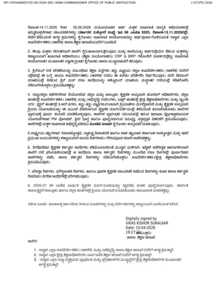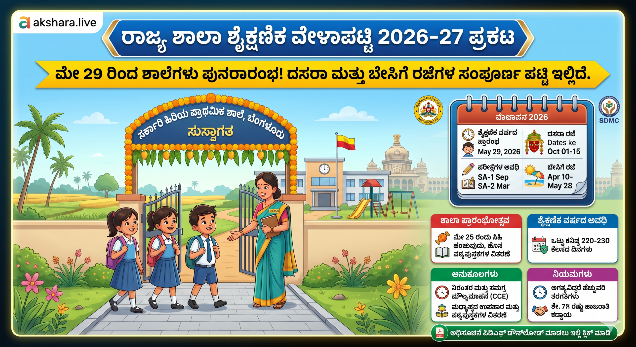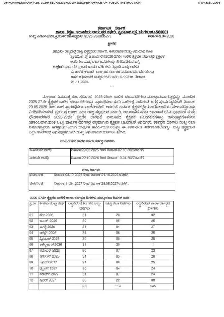 ಕರ್ನಾಟಕ ರಾಜ್ಯ ಶಾಲಾ ಶಿಕ್ಷಣ ಮತ್ತು ಸಾಕ್ಷರತಾ ಇಲಾಖೆಯು 2026-27ನೇ ಶೈಕ್ಷಣಿಕ ಸಾಲಿನ ಅಧಿಕೃತ ಶಾಲಾ ಶೈಕ್ಷಣಿಕ ವೇಳಾಪಟ್ಟಿಯನ್ನು ಪ್ರಕಟಿಸಿದ್ದು, ರಾಜ್ಯದಾದ್ಯಂತ ಪ್ರಾಥಮಿಕ ಮತ್ತು ಪ್ರೌಢಶಾಲೆಗಳ ಪುನರಾರಂಭದ ದಿನಾಂಕ ಹಾಗೂ ರಜೆಗಳ ಪಟ್ಟಿಯನ್ನು ಅಂತಿಮಗೊಳಿಸಿದೆ. ಈ ವೇಳಾಪಟ್ಟಿಯು ರಾಜ್ಯದ ಸರ್ಕಾರಿ, ಅನುದಾನಿತ ಮತ್ತು ಅನುದಾನರಹಿತ ಶಾಲೆಗಳಿಗೆ ಅನ್ವಯವಾಗಲಿದ್ದು, ಶೈಕ್ಷಣಿಕ ಚಟುವಟಿಕೆಗಳು ಸುಗಮವಾಗಿ ನಡೆಯಲು ಮತ್ತು ವಿದ್ಯಾರ್ಥಿಗಳು ಹಾಗೂ ಶಿಕ್ಷಕರು ಮುಂಚಿತವಾಗಿ ಸಿದ್ಧತೆ ಮಾಡಿಕೊಳ್ಳಲು ಪೂರಕವಾಗಿದೆ. ಮುಂಬರುವ ಶೈಕ್ಷಣಿಕ ವರ್ಷದಲ್ಲಿ ಒಟ್ಟು ಲಭ್ಯವಿರುವ ದಿನಗಳು, ಪರೀಕ್ಷೆಗಳ ಸಂಭಾವ್ಯ ಸಮಯ ಮತ್ತು ಪಠ್ಯಕ್ರಮದ ಅವಧಿಯನ್ನು ಗಮನದಲ್ಲಿಟ್ಟುಕೊಂಡು ಈ ಕ್ಯಾಲೆಂಡರ್ ಅನ್ನು ವಿನ್ಯಾಸಗೊಳಿಸಲಾಗಿದೆ.
