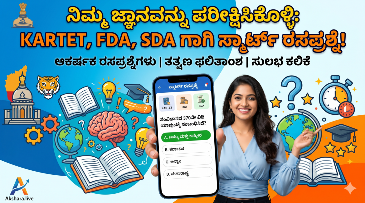 ಕರ್ನಾಟಕ ಸರ್ಕಾರದ ವಿವಿಧ ಸ್ಪರ್ಧಾತ್ಮಕ ಪರೀಕ್ಷೆಗಳಾದ KARTET (ಶಿಕ್ಷಕರ ಅರ್ಹತಾ ಪರೀಕ್ಷೆ), FDA (ಪ್ರಥಮ ದರ್ಜೆ ಸಹಾಯಕ) ಮತ್ತು SDA (ದ್ವಿತೀಯ ದರ್ಜೆ ಸಹಾಯಕ) ಹುದ್ದೆಗಳಿಗೆ ಸಿದ್ಧತೆ ನಡೆಸುತ್ತಿರುವ ಅಭ್ಯರ್ಥಿಗಳಿಗೆ ‘ಸ್ಮಾರ್ಟ್ ರಸಪ್ರಶ್ನೆ’ (Smart Quiz) ಒಂದು ಅತ್ಯುತ್ತಮ ಡಿಜಿಟಲ್ ಕಲಿಕಾ ಸಾಧನವಾಗಿದೆ. ಇಂದಿನ ಸ್ಪರ್ಧಾತ್ಮಕ ಯುಗದಲ್ಲಿ ಕೇವಲ ಪುಸ್ತಕಗಳನ್ನು ಓದುವುದಷ್ಟೇ ಸಾಲದು, ಓದಿದ ವಿಷಯಗಳನ್ನು ನೆನಪಿಟ್ಟುಕೊಳ್ಳಲು ಮತ್ತು ಪರೀಕ್ಷಾ ಸಮಯವನ್ನು ನಿರ್ವಹಿಸಲು ಇಂತಹ ರಸಪ್ರಶ್ನೆಗಳು ಪೂರಕವಾಗಿವೆ. ಕೆಎಸ್ಇಇಬಿ (KSEEB) ಮತ್ತು ಕೆಪಿಎಸ್ಸಿ (KPSC) ನಡೆಸುವ ಈ ಪರೀಕ್ಷೆಗಳ ಪಠ್ಯಕ್ರಮಕ್ಕೆ ಅನುಗುಣವಾಗಿ ವಿನ್ಯಾಸಗೊಳಿಸಲಾದ ಈ ರಸಪ್ರಶ್ನೆಗಳು ಅಭ್ಯರ್ಥಿಗಳಲ್ಲಿ ಆತ್ಮವಿಶ್ವಾಸವನ್ನು ಹೆಚ್ಚಿಸುತ್ತವೆ.