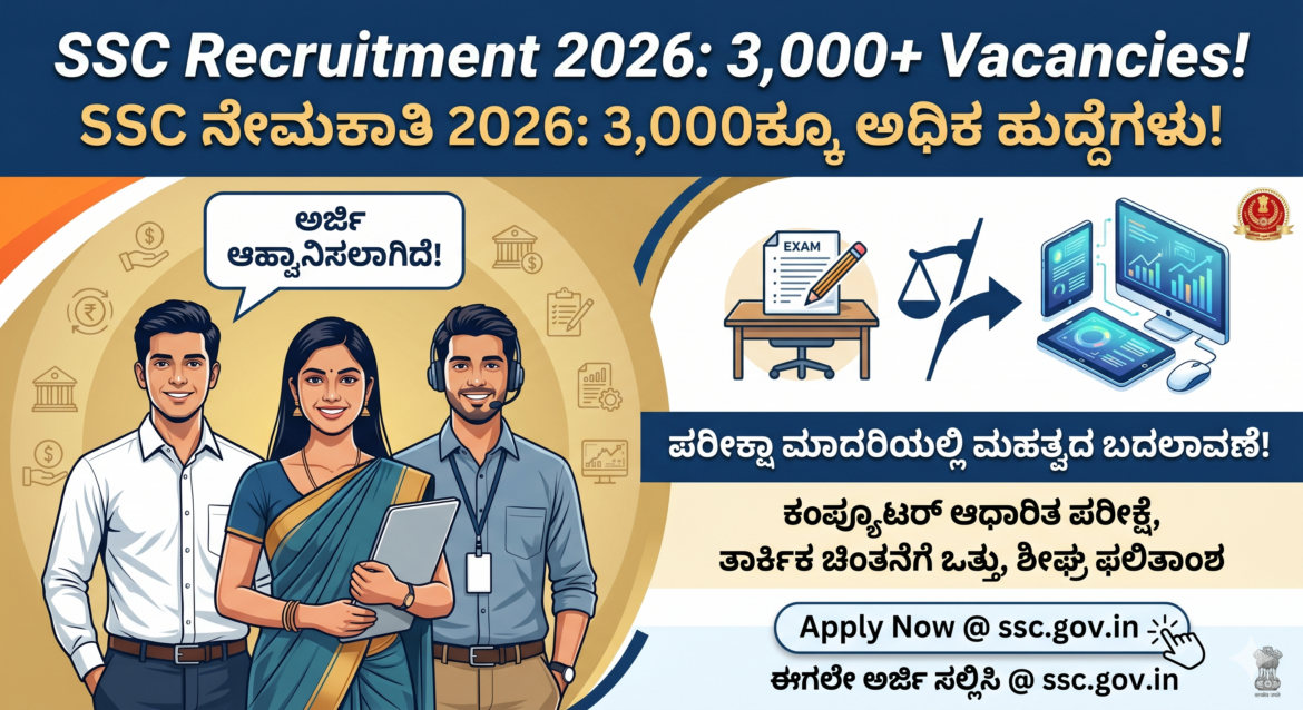 ಕೇಂದ್ರ ಸರ್ಕಾರದ ವಿವಿಧ ಇಲಾಖೆಗಳಲ್ಲಿ ಖಾಲಿ ಇರುವ ಸಾವಿರಾರು ಹುದ್ದೆಗಳನ್ನು ಭರ್ತಿ ಮಾಡಲು ಸಿಬ್ಬಂದಿ ನೇಮಕಾತಿ ಆಯೋಗವು (SSC) 2026ನೇ ಸಾಲಿನ ಬೃಹತ್ ನೇಮಕಾತಿ ಪ್ರಕ್ರಿಯೆಯನ್ನು ಆರಂಭಿಸಿದೆ. ಈ ಬಾರಿ ಅಂದಾಜು 3,000ಕ್ಕೂ ಅಧಿಕ ವಿವಿಧ ದರ್ಜೆಯ ಹುದ್ದೆಗಳಿಗೆ ಅರ್ಜಿ ಆಹ್ವಾನಿಸಲಾಗಿದ್ದು, ಉದ್ಯೋಗಾಕಾಂಕ್ಷಿಗಳಿಗೆ ಇದು ಸುವರ್ಣ ಅವಕಾಶವಾಗಿದೆ. ಈ ನೇಮಕಾತಿಯಲ್ಲಿ ಕೇವಲ ಹುದ್ದೆಗಳ ಸಂಖ್ಯೆ ಮಾತ್ರವಲ್ಲದೆ, ಪರೀಕ್ಷಾ ಪದ್ಧತಿ ಮತ್ತು ಆಯ್ಕೆ ಪ್ರಕ್ರಿಯೆಯಲ್ಲಿ ಕೆಲವು ಕ್ರಾಂತಿಕಾರಿ ಬದಲಾವಣೆಗಳನ್ನು ತರಲಾಗಿದ್ದು, ಅಭ್ಯರ್ಥಿಗಳು ಈ ಹೊಸ ನಿಯಮಗಳನ್ನು ಅರ್ಥಮಾಡಿಕೊಳ್ಳುವುದು ಅತ್ಯಂತ ಅವಶ್ಯಕವಾಗಿದೆ. ಕೇಂದ್ರ ಸರ್ಕಾರದ ಆಡಳಿತ ಯಂತ್ರವನ್ನು ಮತ್ತಷ್ಟು ಬಲಪಡಿಸಲು ಮತ್ತು ಪಾರದರ್ಶಕ ನೇಮಕಾತಿಯನ್ನು ಖಚಿತಪಡಿಸಲು ಈ ಕ್ರಮಗಳನ್ನು ಕೈಗೊಳ್ಳಲಾಗಿದೆ.
