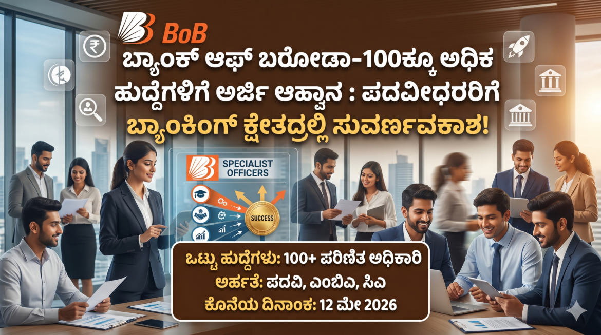 ಭಾರತದ ಪ್ರಮುಖ ಸಾರ್ವಜನಿಕ ವಲಯದ ಬ್ಯಾಂಕುಗಳಲ್ಲಿ ಒಂದಾದ ಬ್ಯಾಂಕ್ ಆಫ್ ಬರೋಡಾ (Bank of Baroda – BoB), ಪ್ರಸಕ್ತ ಹಣಕಾಸು ವರ್ಷದಲ್ಲಿ ತನ್ನ ಬ್ಯಾಂಕಿಂಗ್ ಕಾರ್ಯಾಚರಣೆಯನ್ನು ವಿಸ್ತರಿಸುವ ಗುರಿಯೊಂದಿಗೆ ವಿವಿಧ ವಿಭಾಗಗಳಲ್ಲಿ ಖಾಲಿ ಇರುವ 100ಕ್ಕೂ ಅಧಿಕ ಪರಿಣಿತ ಅಧಿಕಾರಿ (Specialist Officers) ಹುದ್ದೆಗಳ ಭರ್ತಿಗೆ ಅಧಿಕೃತ ಅಧಿಸೂಚನೆಯನ್ನು ಹೊರಡಿಸಿದೆ. ಬ್ಯಾಂಕಿಂಗ್ ಕ್ಷೇತ್ರದಲ್ಲಿ ವೃತ್ತಿಜೀವನವನ್ನು ರೂಪಿಸಿಕೊಳ್ಳಲು ಬಯಸುವ ಮತ್ತು ಈಗಾಗಲೇ ಅನುಭವ ಹೊಂದಿರುವ ಅಭ್ಯರ್ಥಿಗಳಿಗೆ ಇದು ಒಂದು ಶ್ರೇಷ್ಠ ಅವಕಾಶವಾಗಿದೆ. ಈ ನೇಮಕಾತಿಯು ಕೇವಲ ಉದ್ಯೋಗವನ್ನಷ್ಟೇ ನೀಡದೆ, ದೇಶದ ಆರ್ಥಿಕ ವ್ಯವಸ್ಥೆಯಲ್ಲಿ ಪ್ರಮುಖ ಪಾತ್ರ ವಹಿಸುವ ಬ್ಯಾಂಕ್ನ ಭಾಗವಾಗಲು ನೆರವಾಗುತ್ತದೆ. ಈ ಬೃಹತ್ ನೇಮಕಾತಿ ಪ್ರಕ್ರಿಯೆಯ ಕುರಿತಾದ ಸಂಪೂರ್ಣ ಮತ್ತು ವಿಸ್ತೃತ ಮಾಹಿತಿ ಇಲ್ಲಿದೆ.