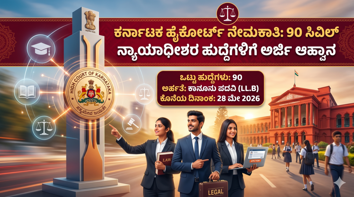 ಕರ್ನಾಟಕ ಉಚ್ಚ ನ್ಯಾಯಾಲಯವು (High Court of Karnataka) ರಾಜ್ಯದ ನ್ಯಾಯಾಂಗ ವ್ಯವಸ್ಥೆಯನ್ನು ಬಲಪಡಿಸಲು ಮತ್ತು ಬಾಕಿ ಇರುವ ಪ್ರಕರಣಗಳ ಶೀಘ್ರ ವಿಲೇವಾರಿಗಾಗಿ ಸಿವಿಲ್ ನ್ಯಾಯಾಧೀಶರ (Civil Judges) ಒಟ್ಟು 90 ಹುದ್ದೆಗಳ ಭರ್ತಿಗೆ ಬೃಹತ್ ನೇಮಕಾತಿ ಅಧಿಸೂಚನೆಯನ್ನು ಹೊರಡಿಸಿದೆ. ಕಾನೂನು ಪದವೀಧರರಿಗೆ ಮತ್ತು ವಕೀಲ ವೃತ್ತಿಯಲ್ಲಿರುವವರಿಗೆ ಇದು ಅತ್ಯಂತ ಗೌರವಯುತ ಮತ್ತು ಜವಾಬ್ದಾರಿಯುತ ವೃತ್ತಿಜೀವನವನ್ನು ಆರಂಭಿಸಲು ಇರುವ ಅತ್ಯುತ್ತಮ ಅವಕಾಶವಾಗಿದೆ. ಈ ನೇಮಕಾತಿ ಪ್ರಕ್ರಿಯೆಯು ಸಂಪೂರ್ಣವಾಗಿ ಅರ್ಹತೆ ಮತ್ತು ಪಾರದರ್ಶಕತೆಯ ಮೇಲೆ ಆಧಾರಿತವಾಗಿದ್ದು, ಅಭ್ಯರ್ಥಿಗಳು ತಮ್ಮ ಕಾನೂನು ಜ್ಞಾನವನ್ನು ಸಾಬೀತುಪಡಿಸಲು ಇದು ಸೂಕ್ತ ವೇದಿಕೆಯಾಗಿದೆ. ಈ ನೇಮಕಾತಿಗೆ ಸಂಬಂಧಿಸಿದ ಅರ್ಹತೆ, ವಯೋಮಿತಿ, ಆಯ್ಕೆ ಪ್ರಕ್ರಿಯೆ ಮತ್ತು ವೇತನದ ಕುರಿತಾದ ವಿಸ್ತೃತ ಮಾಹಿತಿ ಇಲ್ಲಿದೆ.