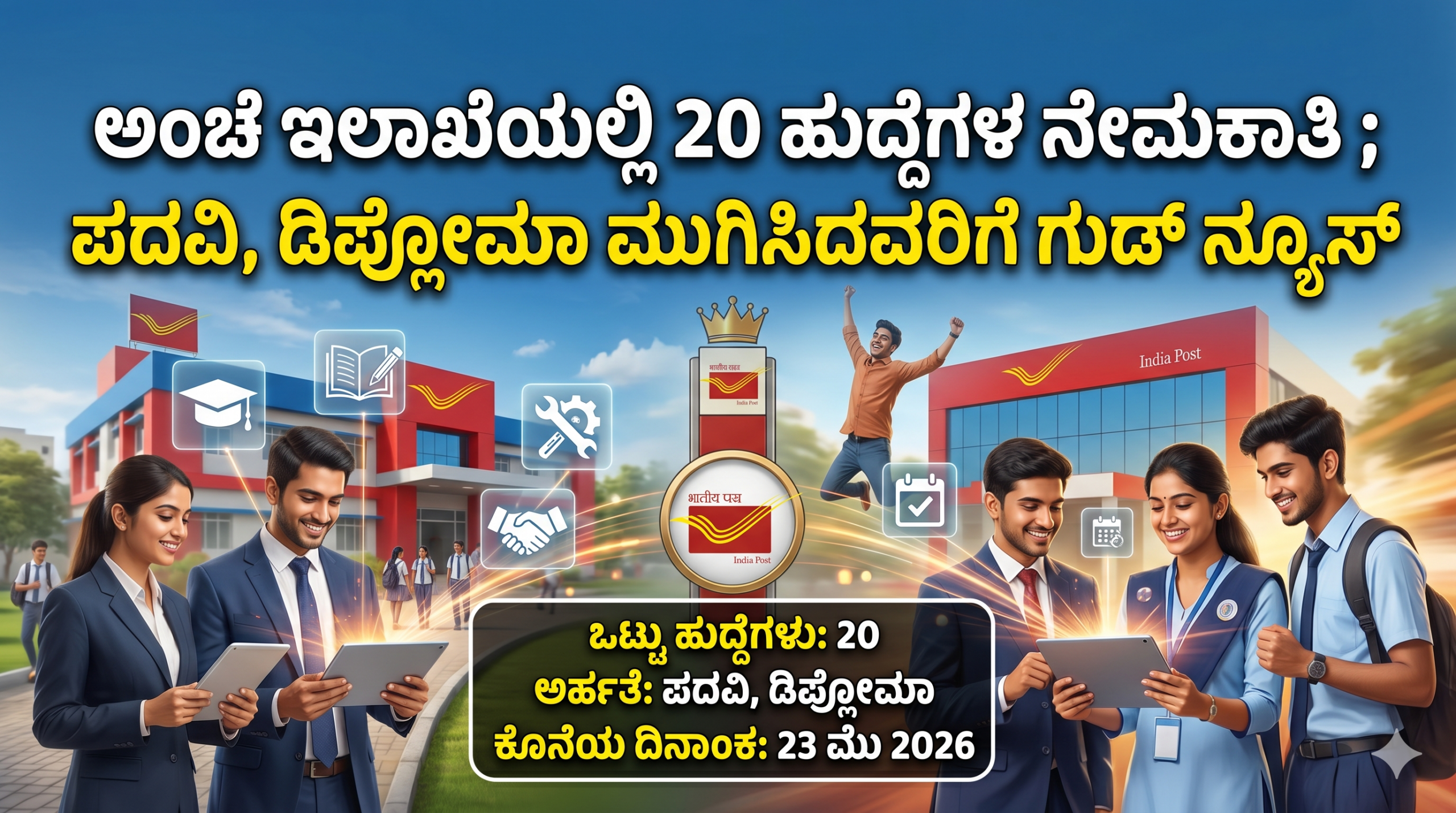 ಭಾರತೀಯ ಅಂಚೆ ಇಲಾಖೆಯು (India Post) ದೇಶದ ಅತ್ಯಂತ ಹಳೆಯ ಮತ್ತು ವಿಶ್ವಾಸಾರ್ಹ ಸರ್ಕಾರಿ ಸಂಸ್ಥೆಗಳಲ್ಲಿ ಒಂದಾಗಿದ್ದು, ಇದೀಗ ತನ್ನ ತಾಂತ್ರಿಕ ಮತ್ತು ಆಡಳಿತಾತ್ಮಕ ವಿಭಾಗಗಳನ್ನು ಬಲಪಡಿಸಲು ಅರ್ಹ ಅಭ್ಯರ್ಥಿಗಳಿಂದ ವಿವಿಧ ಹುದ್ದೆಗಳಿಗೆ ಅರ್ಜಿ ಆಹ್ವಾನಿಸಿದೆ. ಕರ್ನಾಟಕ ಅಂಚೆ ವಲಯ ಸೇರಿದಂತೆ ವಿವಿಧ ವಿಭಾಗಗಳಲ್ಲಿ ಖಾಲಿ ಇರುವ ಒಟ್ಟು 20 ಹುದ್ದೆಗಳ ಭರ್ತಿಗಾಗಿ ಈ ನೇಮಕಾತಿ ಅಧಿಸೂಚನೆಯನ್ನು ಹೊರಡಿಸಲಾಗಿದೆ. ಪದವಿ ಮತ್ತು ಡಿಪ್ಲೋಮಾ ಶಿಕ್ಷಣವನ್ನು ಪೂರೈಸಿ ಸರ್ಕಾರಿ ಉದ್ಯೋಗದ ನಿರೀಕ್ಷೆಯಲ್ಲಿರುವ ಯುವಜನತೆಗೆ ಇದೊಂದು ಉತ್ತಮ ಅವಕಾಶವಾಗಿದೆ. ಅಂಚೆ ಇಲಾಖೆಯು ಕೇವಲ ಪತ್ರಗಳನ್ನು ತಲುಪಿಸುವ ಸಂಸ್ಥೆಯಾಗಿ ಉಳಿಯದೆ, ಇಂದು ಬ್ಯಾಂಕಿಂಗ್, ವಿಮೆ ಮತ್ತು ಇ-ಕಾಮರ್ಸ್ ಕ್ಷೇತ್ರಗಳಲ್ಲಿಯೂ ವಿಸ್ತರಿಸುತ್ತಿರುವುದರಿಂದ, ಈ ನೇಮಕಾತಿಯು ತಾಂತ್ರಿಕ ಕೌಶಲ್ಯ ಹೊಂದಿದವರಿಗೆ ಹೆಚ್ಚಿನ ಪ್ರಾಶಸ್ತ್ಯ ನೀಡುತ್ತಿದೆ. ಈ ನೇಮಕಾತಿಯ ಕುರಿತಾದ ಪೂರ್ಣ ಪ್ರಮಾಣದ ಮಾಹಿತಿ ಇಲ್ಲಿದೆ.