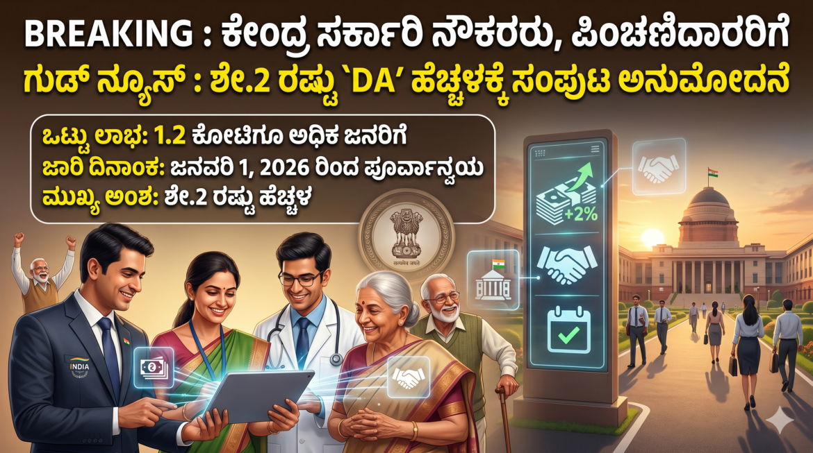 ಕೇಂದ್ರ ಸರ್ಕಾರಿ ನೌಕರರು ಮತ್ತು ಪಿಂಚಣಿದಾರರಿಗೆ ಆರ್ಥಿಕವಾಗಿ ಬಲ ತುಂಬುವಂತಹ ಮಹತ್ವದ ಸುದ್ದಿಯೊಂದು ಹೊರಬಿದ್ದಿದೆ. ಕೇಂದ್ರ ಸಚಿವ ಸಂಪುಟವು ತುಟ್ಟಿ ಭತ್ಯೆಯನ್ನು (DA) ಶೇಕಡಾ 2 ರಷ್ಟು ಹೆಚ್ಚಿಸಲು ಅಧಿಕೃತವಾಗಿ ಅನುಮೋದನೆ ನೀಡಿದ್ದು, ಇದರಿಂದ ಲಕ್ಷಾಂತರ ನೌಕರರು ಮತ್ತು ಪಿಂಚಣಿದಾರರ ಮಾಸಿಕ ಆದಾಯದಲ್ಲಿ ಏರಿಕೆಯಾಗಲಿದೆ. ಹೆಚ್ಚುತ್ತಿರುವ ಜೀವನ ವೆಚ್ಚ ಮತ್ತು ಹಣದುಬ್ಬರವನ್ನು ಸರಿದೂಗಿಸಲು ಕೇಂದ್ರ ಸರ್ಕಾರವು ಈ ಕ್ರಮ ಕೈಗೊಂಡಿದ್ದು, ನೌಕರರ ವಲಯದಲ್ಲಿ ಸಂತಸದ ವಾತಾವರಣ ಮನೆಮಾಡಿದೆ. ಈ ನಿರ್ಧಾರದ ಕುರಿತಾದ ಸಂಪೂರ್ಣ ಮಾಹಿತಿ ಮತ್ತು ಇದರಿಂದ ಯಾರಿಗೆಲ್ಲಾ ಲಾಭವಾಗಲಿದೆ ಎಂಬ ವಿವರಗಳು ಇಲ್ಲಿವೆ.