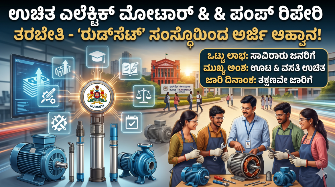 ಗ್ರಾಮೀಣ ಯುವಜನತೆಗೆ ಸ್ವಯಂ ಉದ್ಯೋಗದ ಹಾದಿ ತೋರಿಸುವಲ್ಲಿ ಮುಂಚೂಣಿಯಲ್ಲಿರುವ ಪ್ರತಿಷ್ಠಿತ ‘ರುಡ್ಸೆಟ್’ (RUDSETI) ಸಂಸ್ಥೆಯು ಇದೀಗ ನಿರುದ್ಯೋಗಿ ಯುವಕರಿಗಾಗಿ ‘ಎಲೆಕ್ಟ್ರಿಕ್ ಮೋಟಾರ್ ರಿವೈಂಡಿಂಗ್ ಮತ್ತು ಪಂಪ್ ಸೆಟ್ ರಿಪೇರಿ’ ವಿಷಯದಲ್ಲಿ ಉಚಿತ ತರಬೇತಿ ನೀಡಲು ಅರ್ಜಿ ಆಹ್ವಾನಿಸಿದೆ. ಕೃಷಿ ಪ್ರಧಾನವಾದ ಭಾರತದಲ್ಲಿ ಮೋಟಾರ್ ಮತ್ತು ಪಂಪ್ ಸೆಟ್ಗಳ ಬಳಕೆ ವ್ಯಾಪಕವಾಗಿದ್ದು, ಇವುಗಳ ದುರಸ್ತಿ ಮಾಡುವ ಕೌಶಲ್ಯ ಹೊಂದಿದವರಿಗೆ ಮಾರುಕಟ್ಟೆಯಲ್ಲಿ ಭಾರಿ ಬೇಡಿಕೆಯಿದೆ. ಈ ಹಿನ್ನೆಲೆಯಲ್ಲಿ, ಗ್ರಾಮೀಣ ಭಾಗದ ಯುವಕರು ತಮ್ಮ ಕಾಲಿನ ಮೇಲೆ ತಾವು ನಿಲ್ಲುವಂತೆ ಮಾಡಲು ಈ ತರಬೇತಿ ಕಾರ್ಯಕ್ರಮವನ್ನು ಹಮ್ಮಿಕೊಳ್ಳಲಾಗಿದೆ. ಈ ತರಬೇತಿಯು ಸಂಪೂರ್ಣವಾಗಿ ಉಚಿತವಾಗಿದ್ದು, ಅಭ್ಯರ್ಥಿಗಳಿಗೆ ಊಟ ಮತ್ತು ವಸತಿ ಸೌಲಭ್ಯವನ್ನೂ ಸಂಸ್ಥೆಯೇ ಭರಿಸಲಿದೆ. ಈ ಮಹತ್ವದ ತರಬೇತಿ ಯೋಜನೆಯ ಕುರಿತಾದ ಸಂಪೂರ್ಣ ವಿವರಗಳು ಇಲ್ಲಿವೆ.