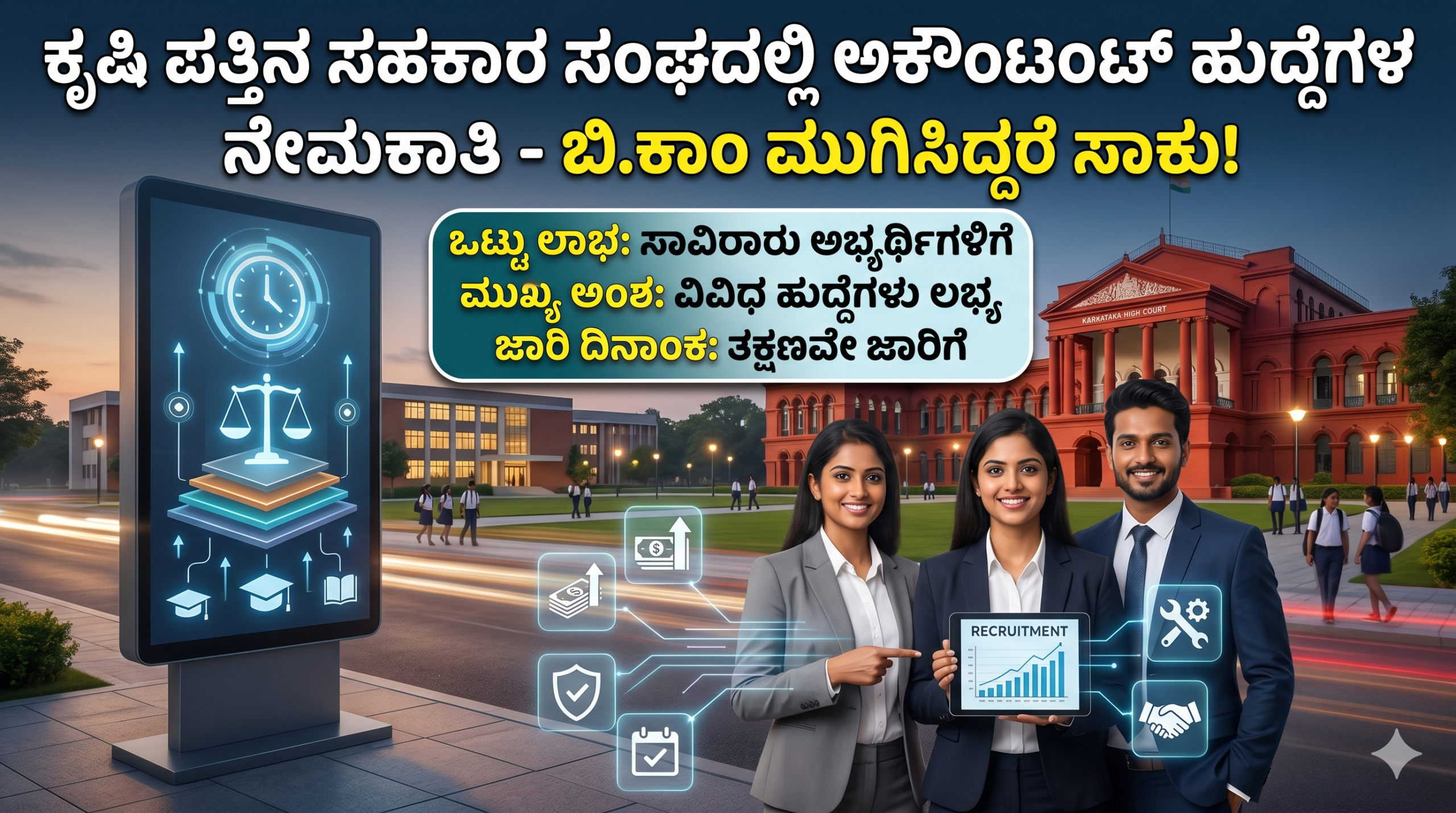 ಕರ್ನಾಟಕದ ಗ್ರಾಮೀಣ ಆರ್ಥಿಕತೆಯ ಬೆನ್ನೆಲುಬಾಗಿರುವ ಕೃಷಿ ಪತ್ತಿನ ಸಹಕಾರ ಸಂಘಗಳಲ್ಲಿ (PACS) ಖಾಲಿ ಇರುವ ಅಕೌಂಟಂಟ್ ಹುದ್ದೆಗಳ ನೇಮಕಾತಿ ಪ್ರಕ್ರಿಯೆಯು ವಾಣಿಜ್ಯ ಪದವೀಧರರಿಗೆ ಹೊಸ ಭರವಸೆಯನ್ನು ತಂದಿದೆ. ವಿಶೇಷವಾಗಿ ಬಿ.ಕಾಂ (B.Com) ಪದವಿ ಪೂರೈಸಿ ಉದ್ಯೋಗದ ನಿರೀಕ್ಷೆಯಲ್ಲಿರುವ ಅಭ್ಯರ್ಥಿಗಳಿಗೆ ತಮ್ಮದೇ ಸ್ಥಳೀಯ ಭಾಗದಲ್ಲಿ ಸರ್ಕಾರಿ ಸ್ವಾಮ್ಯದ ಸಹಕಾರ ವಲಯದಲ್ಲಿ ವೃತ್ತಿಜೀವನವನ್ನು ಆರಂಭಿಸಲು ಇದೊಂದು ಅಮೂಲ್ಯ ಅವಕಾಶವಾಗಿದೆ. ಕೃಷಿ ಪತ್ತಿನ ಸಹಕಾರ ಸಂಘಗಳು ಕೇವಲ ಸಾಲ ನೀಡುವ ಸಂಸ್ಥೆಗಳಲ್ಲದೆ, ರೈತರ ಆರ್ಥಿಕ ಪ್ರಗತಿಯಲ್ಲಿ ಪ್ರಮುಖ ಪಾತ್ರ ವಹಿಸುತ್ತಿವೆ. ಈ ಸಂಸ್ಥೆಗಳಲ್ಲಿ ಹಣಕಾಸಿನ ವಹಿವಾಟುಗಳನ್ನು ನಿರ್ವಹಿಸಲು ದಕ್ಷ ಅಕೌಂಟಂಟ್ ಅಥವಾ ಲೆಕ್ಕಿಗರ ಅವಶ್ಯಕತೆ ಇದ್ದು, ಈ ಕುರಿತಾದ ನೇಮಕಾತಿಯ ಸಮಗ್ರ ವಿವರಗಳನ್ನು ಇಲ್ಲಿ ನೀಡಲಾಗಿದೆ.