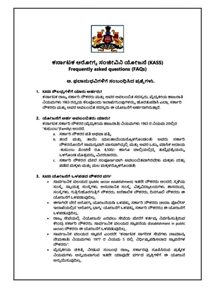 ಕರ್ನಾಟಕ ಸರ್ಕಾರದ ಅಡಿಯಲ್ಲಿ ಸೇವೆ ಸಲ್ಲಿಸುವ ಲಕ್ಷಾಂತರ ನೌಕರರು ಮತ್ತು ಪಿಂಚಣಿದಾರರ ಆರೋಗ್ಯ ಸಂರಕ್ಷಣೆಯ ಅಗತ್ಯವನ್ನು ಪೂರೈಸುವ ಉದ್ದೇಶದಿಂದ ರೂಪುಗೊಂಡ ‘ಆರೋಗ್ಯ ಸಂಜೀವಿನಿ ಯೋಜನೆ’ ಒಂದು ಚಿರಪರಿಚಿತ ಸಮಗ್ರ ಆರೋಗ್ಯ ವಿಮಾ ಕಾರ್ಯಕ್ರಮವಾಗಿದೆ. ಈ ಯೋಜನೆಯು ರಾಜ್ಯ ಸರ್ಕಾರಿ ನೌಕರರು ಮತ್ತು ಅವರ ಕುಟುಂಬಗಳಿಗೆ ವಿತ್ತೀಯ ಭದ್ರತೆಯ ಚೌಕಟ್ಟನ್ನು ನೀಡುವ ಮೂಲಕ ವೈದ್ಯಕೀಯ ಅನನುಭವಗಳ ಸಮಯದಲ್ಲಿ ಅವರು ಆರ್ಥಿಕ ಸಂಕಷ್ಟದಿಂದ ಮುಕ್ತರಾಗುವಂತೆ ಮಾಡುತ್ತದೆ. ಈ ಯೋಜನೆಯ ಅರ್ಹತೆ ಹೊಂದುವವರ ಪಟ್ಟಿಯಲ್ಲಿ ಸಕ್ರಿಯ ಸರ್ಕಾರಿ ನೌಕರರು, ಕಾರ್ಯನಿರ್ವಹಿಸುತ್ತಿರುವ ಅಥವಾ ನಿವೃತ್ತರಾದ ಪಿಂಚಣಿದಾರರು, ಮತ್ತು ಸರ್ಕಾರಿ ಸೇವೆಯಲ್ಲಿದ್ದು ಸೇವೆಯ ಅವಧಿಯಲ್ಲಿ ದುರಂತಕ್ಕೆ ಈಡಾದ ನೌಕರರ ಕುಟುಂಬಗಳ ಸದಸ್ಯರು ಸೇರುತ್ತಾರೆ. ನಿರ್ದಿಷ್ಟವಾಗಿ ಹೇಳುವುದಾದರೆ, ರಾಜ್ಯ ಸರ್ಕಾರದ ಅಡಿಯಲ್ಲಿ ಕಾರ್ಯನಿರ್ವಹಿಸುವ ವಿವಿಧ ಇಲಾಖೆಗಳು, ಸ್ವಾಯತ್ತ ಸಂಸ್ಥೆಗಳು, ಸಾರ್ವಜನಿಕ ಸಂಸ್ಥೆತೆಯ ಉದ್ಯಮಗಳು (PSUs), ಮತ್ತು ಸ್ಥಳೀಯ ಸಂಸ್ಥೆ ಸಂಸ್ಥೆಗಳಲ್ಲಿ (ನಗರ ಸಭೆಗಳು, ಪುರಸಭೆಗಳು, ಮತ್ತು ಗ್ರಾಮ ಪಂಚಾಯತ್ಗಳು) ಸೇವೆ ಸಲ್ಲಿಸುವ ನೌಕರರು ಈ ಯೋಜನೆಯ ಪರಿಧಿಯಲ್ಲಿ ಬರುತ್ತಾರೆ.