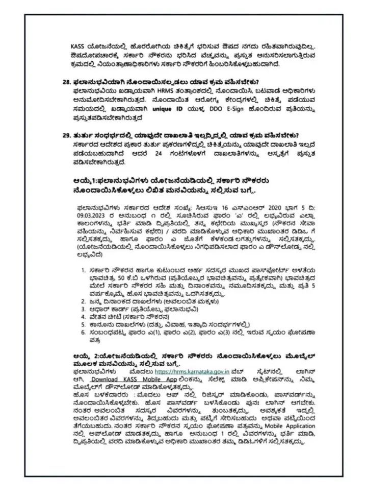 ಈ ಯೋಜನೆಯಲ್ಲಿ ಭಾಗವಹಿಸಲು ನೌಕರರು ತಮ್ಮ ಸಂಬಂಧಿತ ಇಲಾಖೆಗಳ ಮೂಲಕ ನೋಂದಣಿ ಮಾಡಿಸಿಕೊಳ್ಳಬೇಕು ಮತ್ತು ತಮ್ಮ ಕುಟುಂಬದ ಸದಸ್ಯರ ವಿವರಗಳನ್ನು ಸಲ್ಲಿಸಬೇಕು. ನೋಂದಣಿಯ ನಂತರ, ಪ್ರತಿ ನೋಂದಾಯಿತ ಕುಟುಂಬಕ್ಕೆ ಒಂದು ಅನನ್ಯ ಆರೋಗ್ಯ ಸಂಜೀವಿನಿ ಖಾತೆ ಸಂಖ್ಯೆ (Health Sanjeevini Account Number) ನೀಡಲಾಗುತ್ತದೆ, ಇದರ ಮೂಲಕ ಅವರು ಚಿಕಿತ್ಸೆ ಪಡೆಯಬಹುದು ಮತ್ತು ದಾವೆಗಳನ್ನು ನಿರ್ವಹಿಸಬಹುದು. ಈ ಯೋಜನೆಯ ಅಡಿಯಲ್ಲಿ ಚಿಕಿತ್ಸೆ ಪಡೆಯಲು, ನೋಂದಾಯಿತ ಆಸ್ಪತ್ರೆಗಳಲ್ಲಿ (ಸರ್ಕಾರಿ ಮತ್ತು ಖಾಸಗಿ ಎರಡೂ) ಭರ್ತಿ ಆಗಬೇಕು ಮತ್ತು ಚಿಕಿತ್ಸೆಯ ನಂತರ ಅಗತ್ಯ ದಾವೆ ದಾಖಲೆಗಳನ್ನು ಸಲ್ಲಿಸಬೇಕು. ಈ ಯೋಜನೆಯನ್ನು ಕರ್ನಾಟಕ ಸರ್ಕಾರದ ವಿತ್ತ ಇಲಾಖೆಯು ನಿರ್ವಹಿಸುತ್ತದೆ ಮತ್ತು ಸಾಮಾನ್ಯವಾಗಿ ಒಂದು ಪ್ರಮುಖ ವಿಮಾ ಕಂಪನಿಯು (ಉದಾಹರಣೆಗೆ, ಯುನೈಟೆಡ್ ಇಂಡಿಯಾ ಇನ್ಶುರೆನ್ಸ್ ಕಂಪನಿ) ವಿಮಾ ಸೇವೆಯನ್ನು ಒದಗಿಸುತ್ತದೆ. ಯೋಜನೆಯ ನಿರ್ದಿಷ್ಟ ನಿಯಮಗಳು, ಪಠ್ಯಕ್ರಮ, ಮತ್ತು ಮಿತಿಗಳು ಸರ್ಕಾರಿ ನಿರ್ಣಯಗಳು ಮತ್ತು ಅಧಿಸೂಚನೆಗಳಿಗೆ ಅನುಗುಣವಾಗಿ ಬದಲಾಗಬಹುದು, ಆದ್ದರಿಂದ ನೌಕರರು ತಮ್ಮ ಸಂಬಂಧಿತ ಇಲಾಖೆಗಳಿಂದ ಅಥವಾ ಆರೋಗ್ಯ ಸಂಜೀವಿನಿ ಆಧಿಕೃತ ವೆಬ್ಸೈಟ್ನಿಂದ ನವೀನ ಮಾಹಿತಿಯನ್ನು ಪಡೆದುಕೊಳ್ಳುವುದು ಅತ್ಯಗತ್ಯ. ಒಟ್ಟಾರೆಯಾಗಿ, ಈ ಯೋಜನೆಯು ರಾಜ್ಯ ಸರ್ಕಾರಿ ನೌಕರರಿಗೆ ಮತ್ತು ಅವರ ಕುಟುಂಬಗಳಿಗೆ ಒಂದು ಗಮನಾರ್ಹ ಸುರಕ್ಷತಾ ಜಾಲವನ್ನು ಒದಗಿಸುತ್ತದೆ, ಇದು ಅವರ ಜೀವನದ ಗುಣಮಟ್ಟವನ್ನು ಉನ್ನತ ಮಟ್ಟಕ್ಕೇರಿಸುತ್ತದೆ ಮತ್ತು ಸರ್ಕಾರಿ ಸೇವೆಯನ್ನು ಒಂದು ಆಕರ್ಷಕ ವೃತ್ತಿ ಆಯ್ಕೆಯನ್ನಾಗಿ ಮಾಡುತ್ತದೆ.