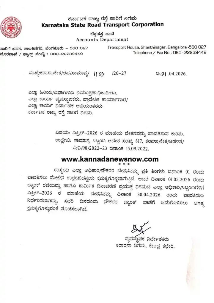 ಗಮನಿಸಿ: ಸಾರಿಗೆ ನೌಕರರು ತಮ್ಮ ಬ್ಯಾಂಕ್ ಖಾತೆಯ ವಿವರಗಳನ್ನು ಮತ್ತು ಆಧಾರ್ ಜೋಡಣೆಯನ್ನು ಸರಿಯಾಗಿಟ್ಟುಕೊಂಡಿರಲು ಸೂಚಿಸಲಾಗಿದೆ, ಇದರಿಂದ ವೇತನ ಜಮೆಯಾಗುವಾಗ ಯಾವುದೇ ತಾಂತ್ರಿಕ ಅಡಚಣೆಗಳು ಉಂಟಾಗುವುದಿಲ್ಲ.