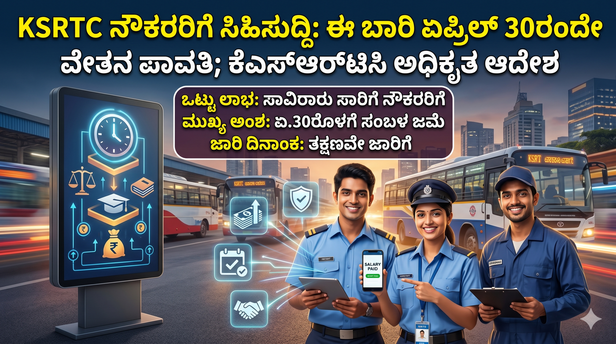 ಕರ್ನಾಟಕ ರಾಜ್ಯ ರಸ್ತೆ ಸಾರಿಗೆ ಸಂಸ್ಥೆಯ (KSRTC) ಸಾವಿರಾರು ನೌಕರರಿಗೆ ಈ ಬಾರಿ ಸರ್ಕಾರವು ಮುಂಚಿತವಾಗಿಯೇ ವೇತನ ನೀಡುವ ಮೂಲಕ ಸಂತಸದ ಸುದ್ದಿ ನೀಡಿದೆ. ಸಾಮಾನ್ಯವಾಗಿ ಪ್ರತಿ ತಿಂಗಳ ಆರಂಭದಲ್ಲಿ ದೊರೆಯುತ್ತಿದ್ದ ವೇತನವು ಈ ಬಾರಿ ಏಪ್ರಿಲ್ ತಿಂಗಳ ಕೊನೆಯ ದಿನವಾದ 30ರಂದೇ ನೌಕರರ ಬ್ಯಾಂಕ್ ಖಾತೆಗಳಿಗೆ ಜಮೆಯಾಗಲಿದೆ. ಈ ಕುರಿತು ಸಾರಿಗೆ ಸಂಸ್ಥೆಯು ಅಧಿಕೃತ ಸುತ್ತೋಲೆಯನ್ನು ಹೊರಡಿಸಿದ್ದು, ನೌಕರರ ಹಿತದೃಷ್ಟಿಯಿಂದ ಈ ಕ್ರಮ ಕೈಗೊಳ್ಳಲಾಗಿದೆ.