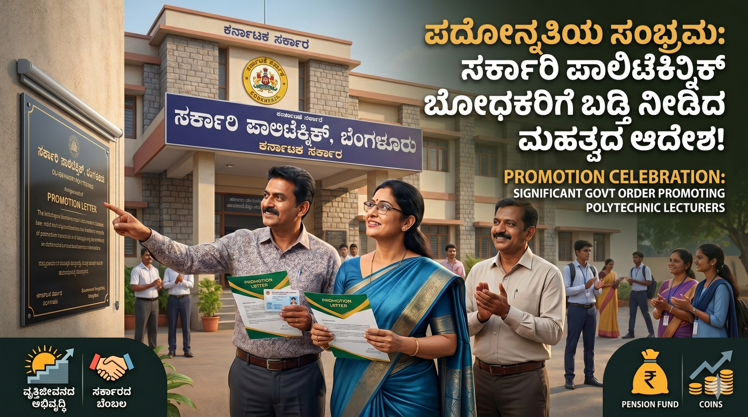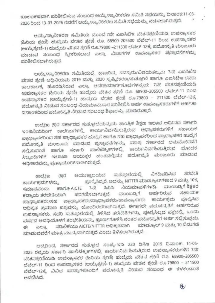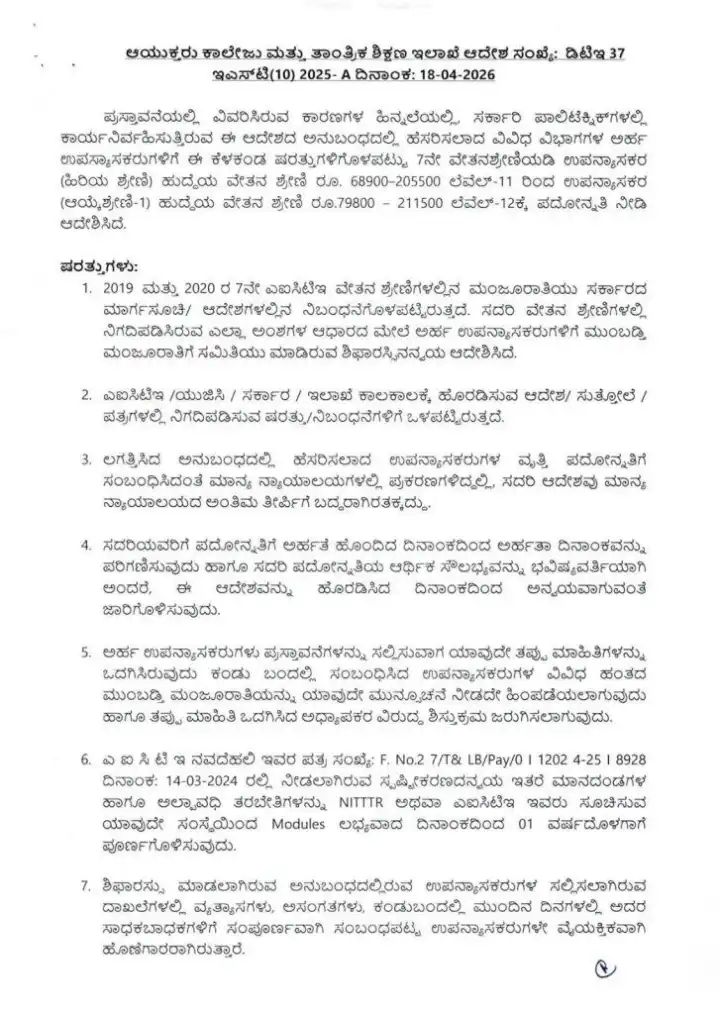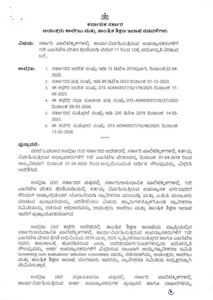 ರಾಜ್ಯದ ತಾಂತ್ರಿಕ ಶಿಕ್ಷಣ ಇಲಾಖೆಯ ಅಡಿಯಲ್ಲಿ ಕಾರ್ಯನಿರ್ವಹಿಸುತ್ತಿರುವ ಸರ್ಕಾರಿ ಪಾಲಿಟೆಕ್ನಿಕ್ ಕಾಲೇಜುಗಳ ಉಪನ್ಯಾಸಕರಿಗೆ ರಾಜ್ಯ ಸರ್ಕಾರವು ಬಹುದಿನಗಳ ಬೇಡಿಕೆಯನ್ನು ಈಡೇರಿಸುವ ಮೂಲಕ ಭರ್ಜರಿ ಗುಡ್ ನ್ಯೂಸ್ ನೀಡಿದೆ. ಹಲವು ವರ್ಷಗಳಿಂದ ಪದೋನ್ನತಿಗಾಗಿ ಕಾಯುತ್ತಿದ್ದ ನೂರಾರು ಉಪನ್ಯಾಸಕರಿಗೆ ಈಗ ವೃತ್ತಿಜೀವನದಲ್ಲಿ ಹೊಸ ಆಯಾಮ ದೊರೆತಿದೆ. ಸರ್ಕಾರದ ಈ ನಿರ್ಧಾರವು ತಾಂತ್ರಿಕ ಶಿಕ್ಷಣ ಕ್ಷೇತ್ರದಲ್ಲಿ ಕೆಲಸ ಮಾಡುತ್ತಿರುವ ಬೋಧಕ ವರ್ಗದವರಲ್ಲಿ ಸಂತಸವನ್ನು ಮೂಡಿಸಿದ್ದು, ಅವರ ಸೇವೆಯನ್ನು ಗುರುತಿಸಿ ಮುಂದಿನ ಹಂತಕ್ಕೆ ಏರಿಸುವ ಪ್ರಕ್ರಿಯೆಗೆ ಅಧಿಕೃತ ಮುದ್ರೆ ಬಿದ್ದಿದೆ.