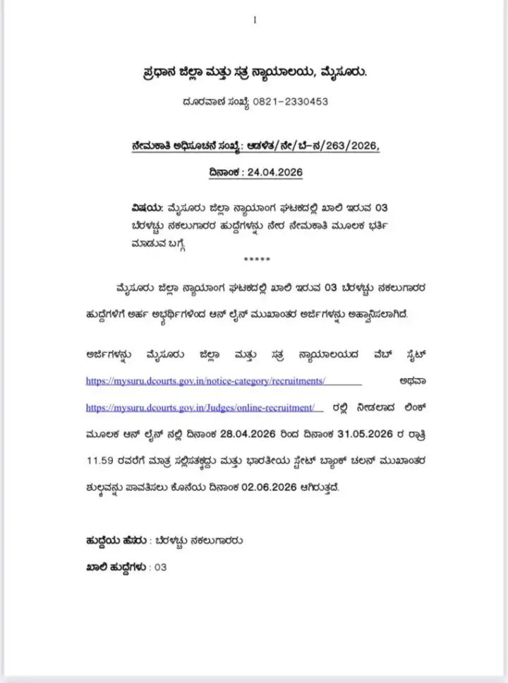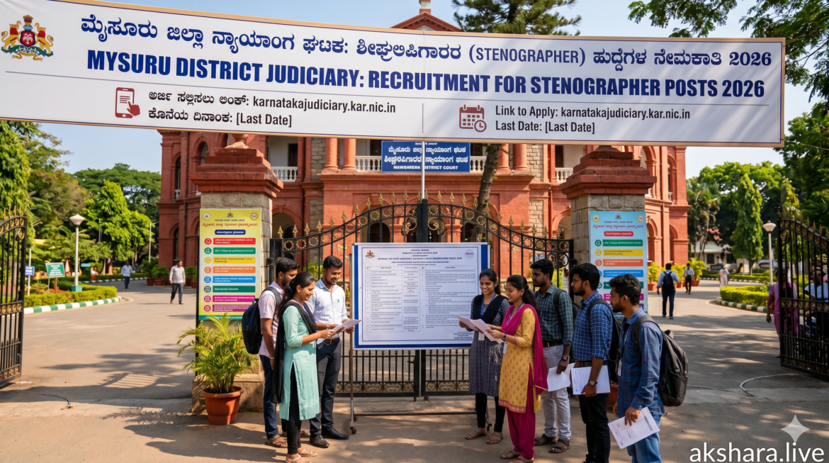ಕರ್ನಾಟಕ ಸರ್ಕಾರದ ನ್ಯಾಯಾಂಗ ಇಲಾಖೆಯ ಅಡಿಯಲ್ಲಿ ಬರುವ ಮೈಸೂರು ಜಿಲ್ಲಾ ಮತ್ತು ಸತ್ರ ನ್ಯಾಯಾಲಯವು ಖಾಲಿ ಇರುವ ಶೀಘ್ರಲಿಪಿಗಾರ (Stenographer) ಹುದ್ದೆಗಳನ್ನು ಭರ್ತಿ ಮಾಡಲು ಅಧಿಕೃತ ಅಧಿಸೂಚನೆಯನ್ನು ಹೊರಡಿಸಿದೆ. ನ್ಯಾಯಾಂಗ ವ್ಯವಸ್ಥೆಯಲ್ಲಿ ಶೀಘ್ರಲಿಪಿಗಾರರ ಪಾತ್ರವು ಅತ್ಯಂತ ನಿರ್ಣಾಯಕವಾಗಿದ್ದು, ನ್ಯಾಯಾಧೀಶರ ಆದೇಶಗಳು ಮತ್ತು ಸಾಕ್ಷಿಗಳ ಹೇಳಿಕೆಗಳನ್ನು ನಿಖರವಾಗಿ ದಾಖಲಿಸುವ ಜವಾಬ್ದಾರಿ ಇವರ ಮೇಲಿರುತ್ತದೆ. ಮೈಸೂರು ಜಿಲ್ಲೆಯ ನ್ಯಾಯಾಲಯಗಳಲ್ಲಿ ಕೆಲಸ ಮಾಡುವ ಇಚ್ಛೆ ಹೊಂದಿರುವ ಮತ್ತು ನಿಗದಿತ ತಾಂತ್ರಿಕ ಅರ್ಹತೆ ಹೊಂದಿರುವ ಅಭ್ಯರ್ಥಿಗಳಿಗೆ ಇದು ಒಂದು ಶ್ರೇಷ್ಠ ವೃತ್ತಿಜೀವನದ ಅವಕಾಶವಾಗಿದೆ. ಈ ನೇಮಕಾತಿಯು ಸಂಪೂರ್ಣವಾಗಿ ಪಾರದರ್ಶಕವಾಗಿದ್ದು, ಅರ್ಹ ಅಭ್ಯರ್ಥಿಗಳು ನಿಗದಿತ ಅವಧಿಯೊಳಗೆ ಆನ್ಲೈನ್ ಮೂಲಕ ಅರ್ಜಿಯನ್ನು ಸಲ್ಲಿಸಬಹುದಾಗಿದೆ.