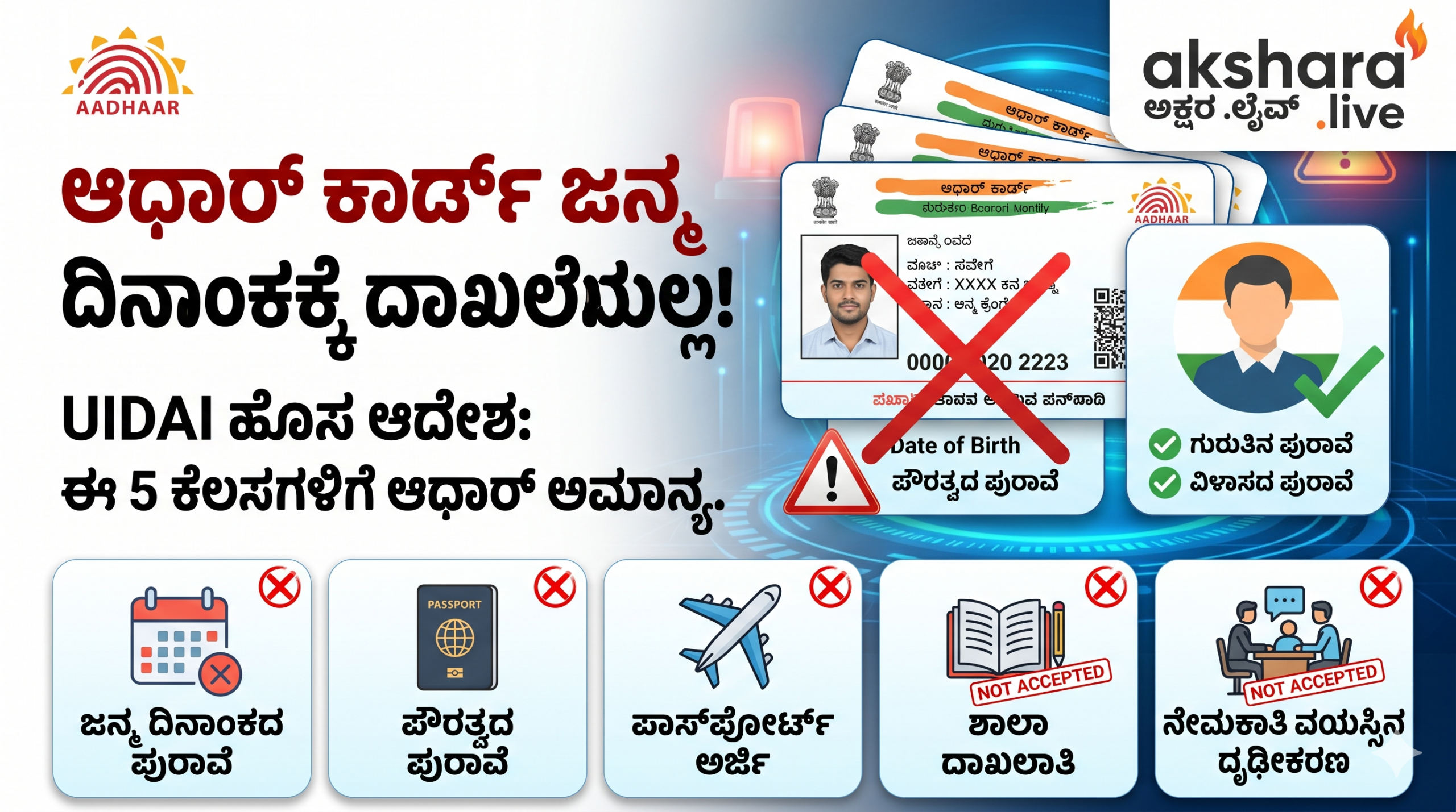 ಹೊಸ ಆದೇಶದ ಪ್ರಕಾರ, ಯಾವುದೇ ಅಧಿಕೃತ ಉದ್ದೇಶಗಳಿಗಾಗಿ ಜನ್ಮ ದಿನಾಂಕವನ್ನು ದೃಢೀಕರಿಸಲು ಆಧಾರ್ ಕಾರ್ಡ್ ಅನ್ನು ಇನ್ನು ಮುಂದೆ ದಾಖಲೆಯಾಗಿ ಸ್ವೀಕರಿಸಲಾಗುವುದಿಲ್ಲ. ಈ ಹಿಂದೆ ಶಾಲೆಗಳ ದಾಖಲಾತಿ, ಪಾಸ್ಪೋರ್ಟ್ ಅರ್ಜಿ ಅಥವಾ ಇತರೆ ಕೆಲಸಗಳಿಗೆ ಆಧಾರ್ನಲ್ಲಿರುವ ಜನ್ಮ ದಿನಾಂಕವನ್ನೇ ಅಂತಿಮ ಎಂದು ಪರಿಗಣಿಸಲಾಗುತ್ತಿತ್ತು. ಆದರೆ ಆಧಾರ್ ಎಂಬುದು ವ್ಯಕ್ತಿಯ ಬಯೋಮೆಟ್ರಿಕ್ ಆಧಾರಿತ ಗುರುತಿಸುವಿಕೆಯ ಪ್ರಕ್ರಿಯೆಯೇ ಹೊರತು, ಅದು ಜನ್ಮ ದಾಖಲಾತಿ ಪತ್ರವಲ್ಲ ಎಂದು ಪ್ರಾಧಿಕಾರ ಹೇಳಿದೆ. ಆದ್ದರಿಂದ, ಇನ್ನು ಮುಂದೆ ಜನ್ಮ ದಿನಾಂಕದ ದೃಢೀಕರಣಕ್ಕೆ ಜನನ ಪ್ರಮಾಣ ಪತ್ರ (Birth Certificate) ಅಥವಾ ಎಸ್ಎಸ್ಎಲ್ಸಿ (SSLC) ಅಂಕಪಟ್ಟಿಗಳನ್ನು ಮಾತ್ರ ಕಡ್ಡಾಯವಾಗಿ ಒದಗಿಸಬೇಕಾಗುತ್ತದೆ.