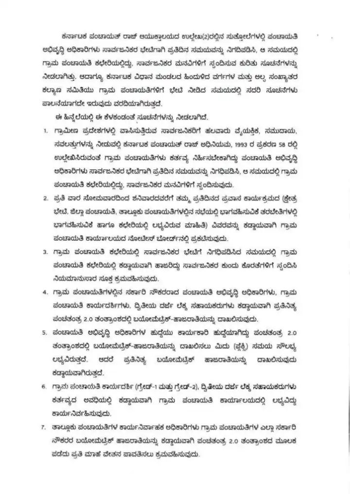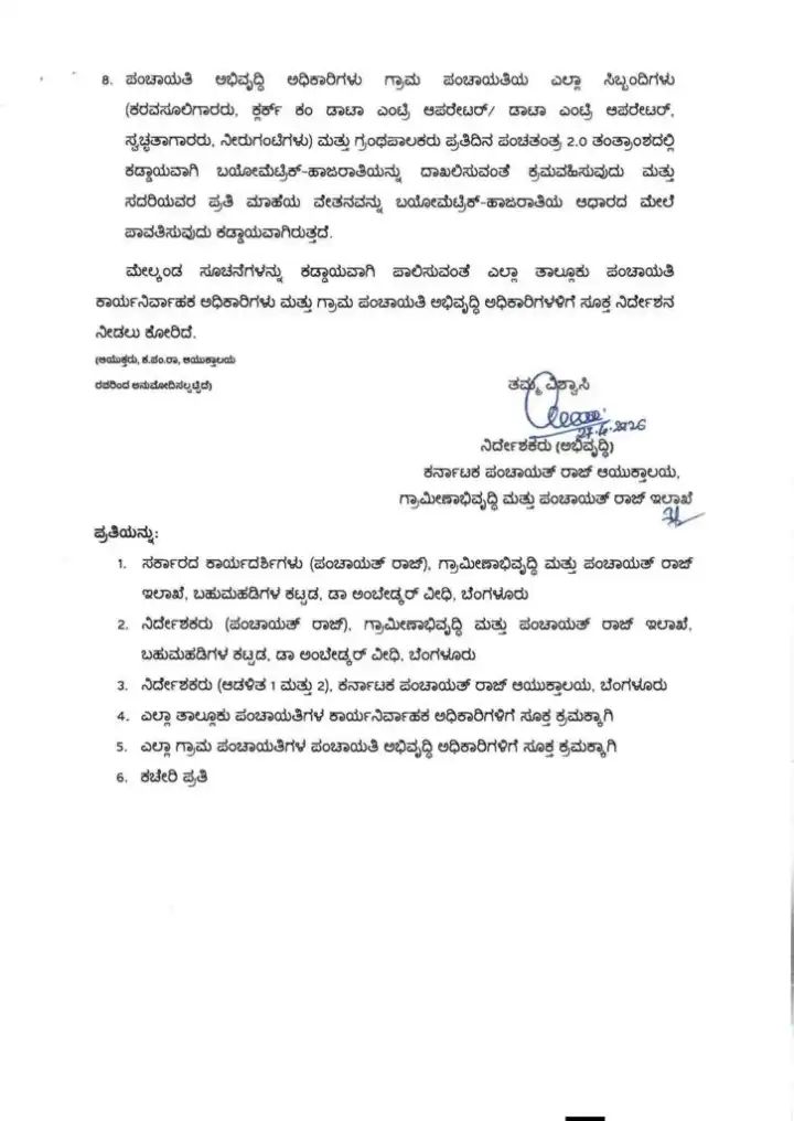 ರಾಜ್ಯದ ಪ್ರತಿಯೊಂದು ಗ್ರಾಮ ಪಂಚಾಯಿತಿ ಕಚೇರಿಯಲ್ಲಿಯೂ ಬಯೋಮೆಟ್ರಿಕ್ ಯಂತ್ರಗಳನ್ನು ಅಳವಡಿಸಲು ಸೂಚನೆ ನೀಡಲಾಗಿದೆ. ಪಿಡಿಒಗಳು ಸೇರಿದಂತೆ ಪಂಚಾಯಿತಿಯ ಎಲ್ಲಾ ಸಿಬ್ಬಂದಿಗಳು ಬೆಳಿಗ್ಗೆ ಕಚೇರಿಗೆ ಬಂದಾಗ ಮತ್ತು ಸಂಜೆ ಕಚೇರಿಯಿಂದ ನಿರ್ಗಮಿಸುವಾಗ ಬಯೋಮೆಟ್ರಿಕ್ ಹಾಜರಾತಿ ನೀಡುವುದು ಕಡ್ಡಾಯ. ಈ ಡೇಟಾವು ನೇರವಾಗಿ ತಾಲ್ಲೂಕು ಮತ್ತು ಜಿಲ್ಲಾ ಪಂಚಾಯಿತಿಗಳ ಕೇಂದ್ರ ಸರ್ವರ್ಗೆ ಲಿಂಕ್ ಆಗಿರುತ್ತದೆ. ಇದರಿಂದ ಅಧಿಕಾರಿಗಳು ಎಷ್ಟು ಗಂಟೆಗೆ ಕಚೇರಿಗೆ ಬರುತ್ತಾರೆ ಮತ್ತು ಎಷ್ಟು ಸಮಯ ಸಾರ್ವಜನಿಕರ ಸೇವೆಗೆ ಲಭ್ಯವಿರುತ್ತಾರೆ ಎಂಬುದು ಮೇಲಧಿಕಾರಿಗಳಿಗೆ ಕ್ಷಣಾರ್ಧದಲ್ಲಿ ತಿಳಿಯಲಿದೆ. ಸಾರ್ವಜನಿಕ ಕೆಲಸಗಳ ವಿಳಂಬವನ್ನು ತಪ್ಪಿಸಲು ಇದು ಸಹಕಾರಿಯಾಗಲಿದೆ.
