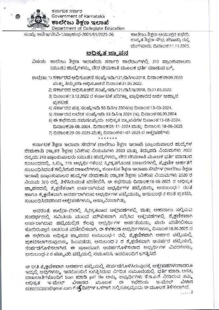 ಕರ್ನಾಟಕ ರಾಜ್ಯದ ಉನ್ನತ ಶಿಕ್ಷಣ ವ್ಯವಸ್ಥೆಯಲ್ಲಿ ಒಂದು ಗಮನಾರ್ಹ ಮತ್ತು ಸ್ವಾಗತಾರ್ಹ ಬದಲಾವಣೆಯನ್ನು ತರುವ ನಿರ್ಣಯವೊಂದನ್ನು ರಾಜ್ಯ ಸರ್ಕಾರ ಘೋಷಿಸಿದೆ. ರಾಜ್ಯದ ಸರ್ಕಾರಿ ಕಾಲೇಜುಗಳಲ್ಲಿ ಸುಮಾರು 310 ಪ್ರಾಂಶುಪಾಲರ ಹುದ್ದೆಗಳಿಗೆ ನೇರ ನೇಮಕಾತಿ ಪ್ರಕ್ರಿಯೆಯನ್ನು ಆರಂಭಿಸುವ ಮಹತ್ವದ ಆದೇಶವನ್ನು ಸರ್ಕಾರ ನೀಡಿದೆ. ಈ ನಿರ್ಣಯವು ದೀರ್ಘಕಾಲದಿಂದ ಬಾಕಿ ಇದ್ದ ನೇಮಕಾತಿ ఖాళీಗಳನ್ನು ತುಂಬುವುದರ ಮೂಲಕ ಕಾಲೇಜುಗಳ ನಿರ್ವಹಣೆ ಮತ್ತು ಶೈಕ್ಷಣಿಕ ವಾತಾವರಣವನ್ನು ಬಲಪಡಿಸುವ ಉದ್ದೇಶವನ್ನು ಹೊಂದಿದೆ.